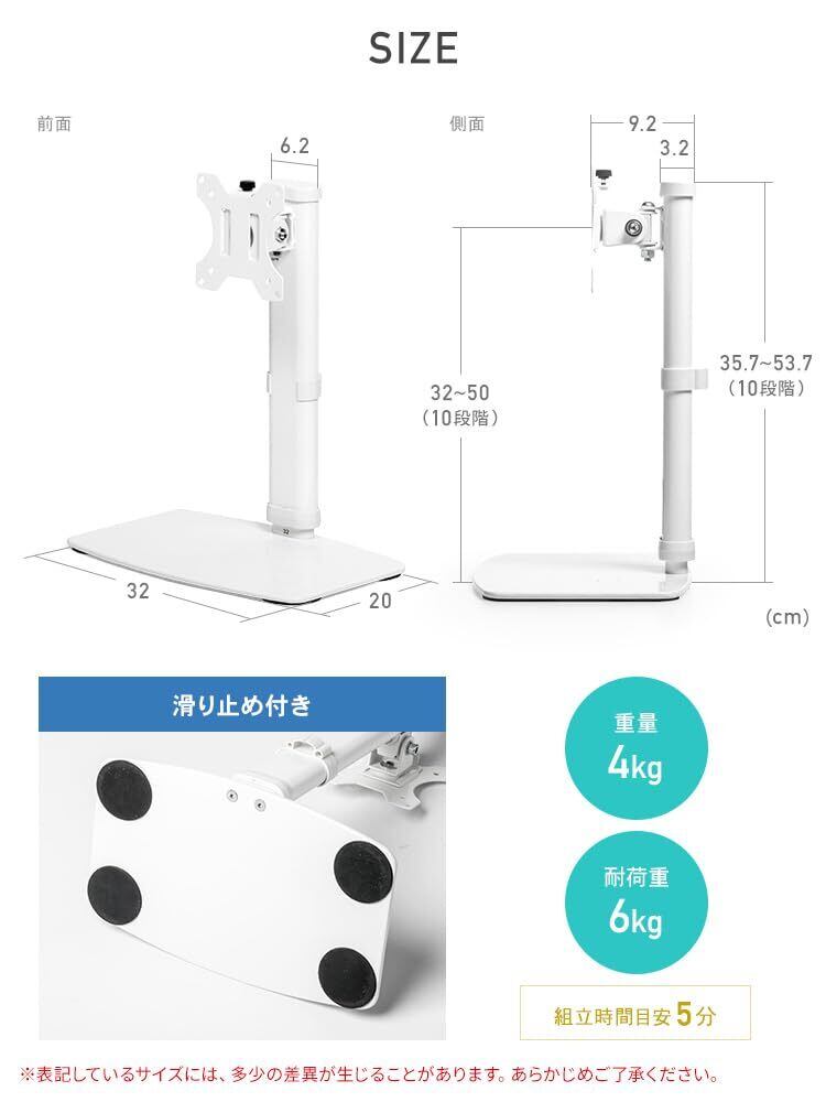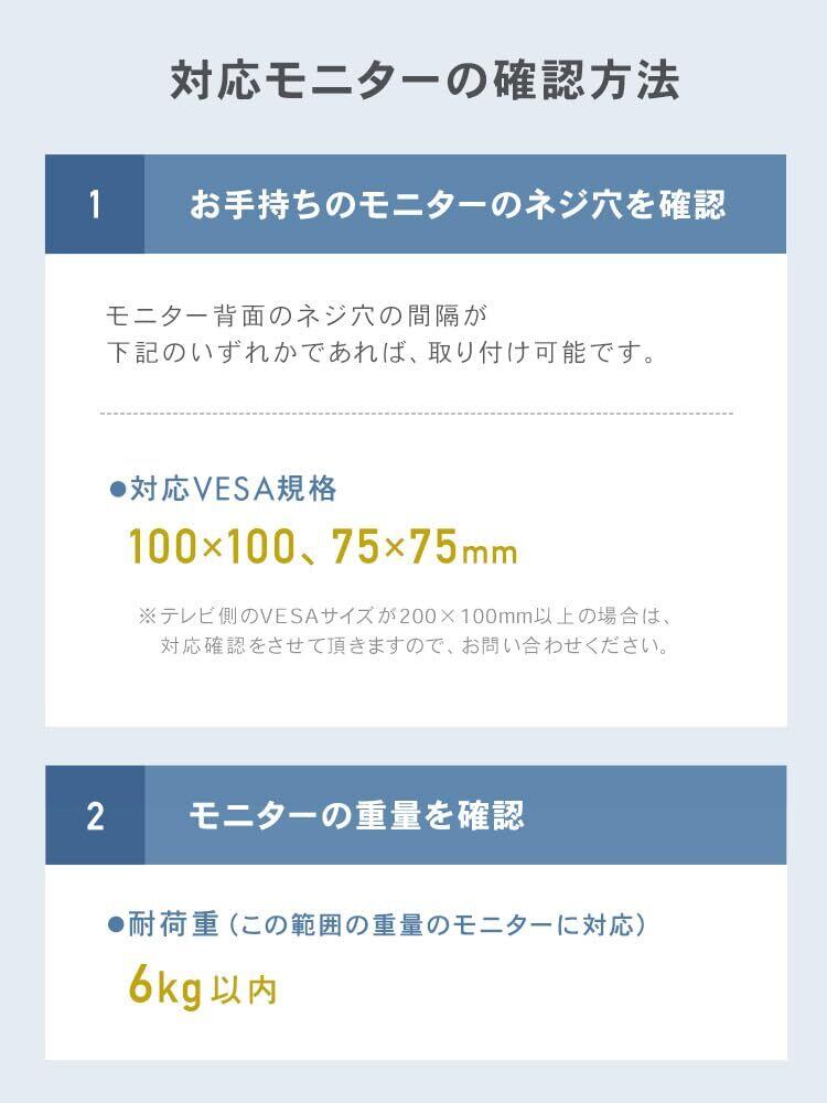 商品サイズ(cm): 27インチ程度のモニターに対応し、耐荷重6kgのしっかりした作り。VESA規格(75×75mm / 100×100mm)にも対応しており、自由に位置調整ができるため、快適なデスク環境を実現します。