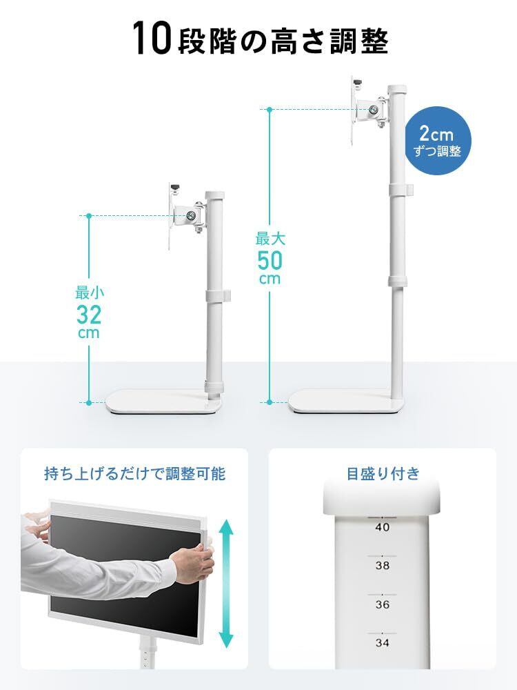 液晶モニターを目線の高さに合わせて上下調節が行えます。画面の向きを上に60度、下に20度、左右に30度ずつ角度調節、360度回転させることができます。スタンド裏側全面に滑り止めがついているので大型モニターの転倒防止におすすめです。