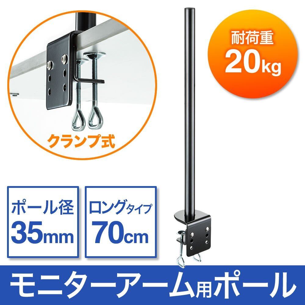 商品サイズ(cm): 長さ70cm、直径3.5cmのポールで、クランプ式によりデスクにしっかり固定できるモニターアームです。支柱のみの構造ですので、様々なモニターに対応し、設置場所を選ばず使用することができます。