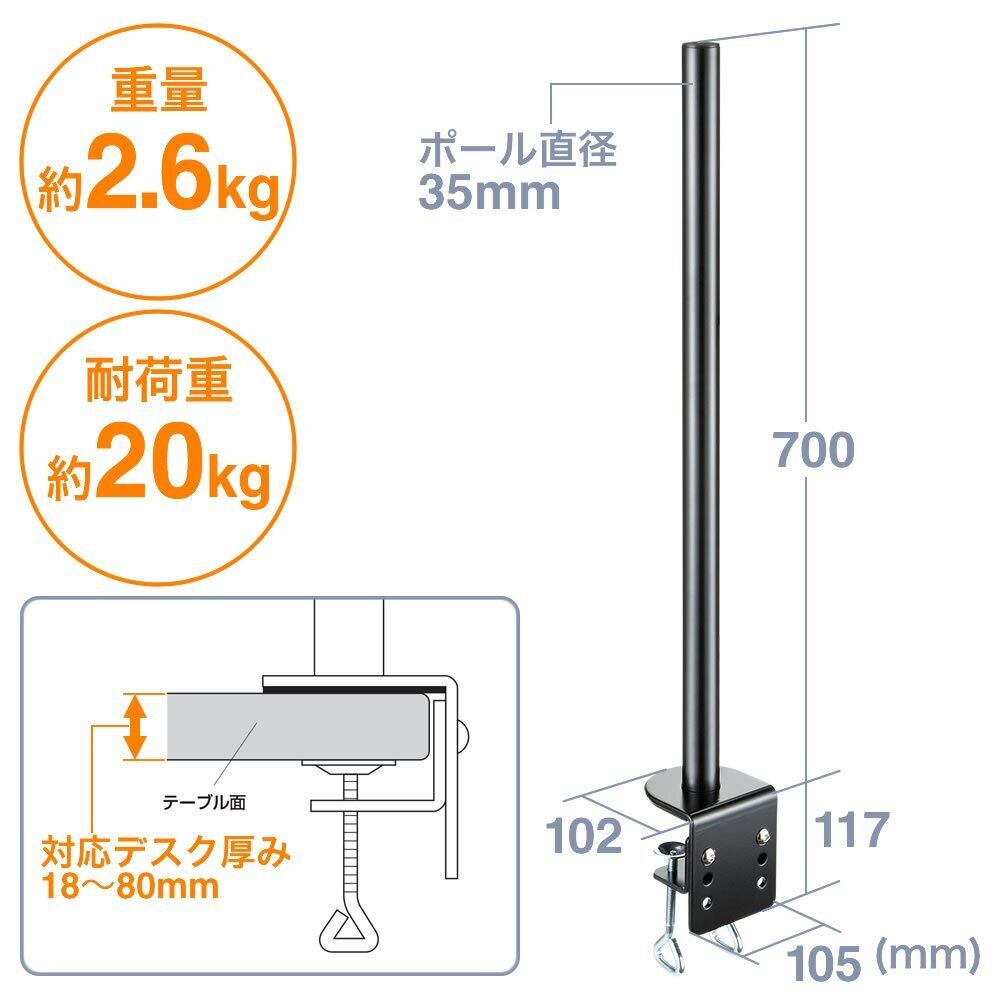 イーサプライ モニターアーム ポール ロング 長さ70cm 直径3.5㎝ クランプ式 支柱のみ デスク設置 EEX-LAP01N