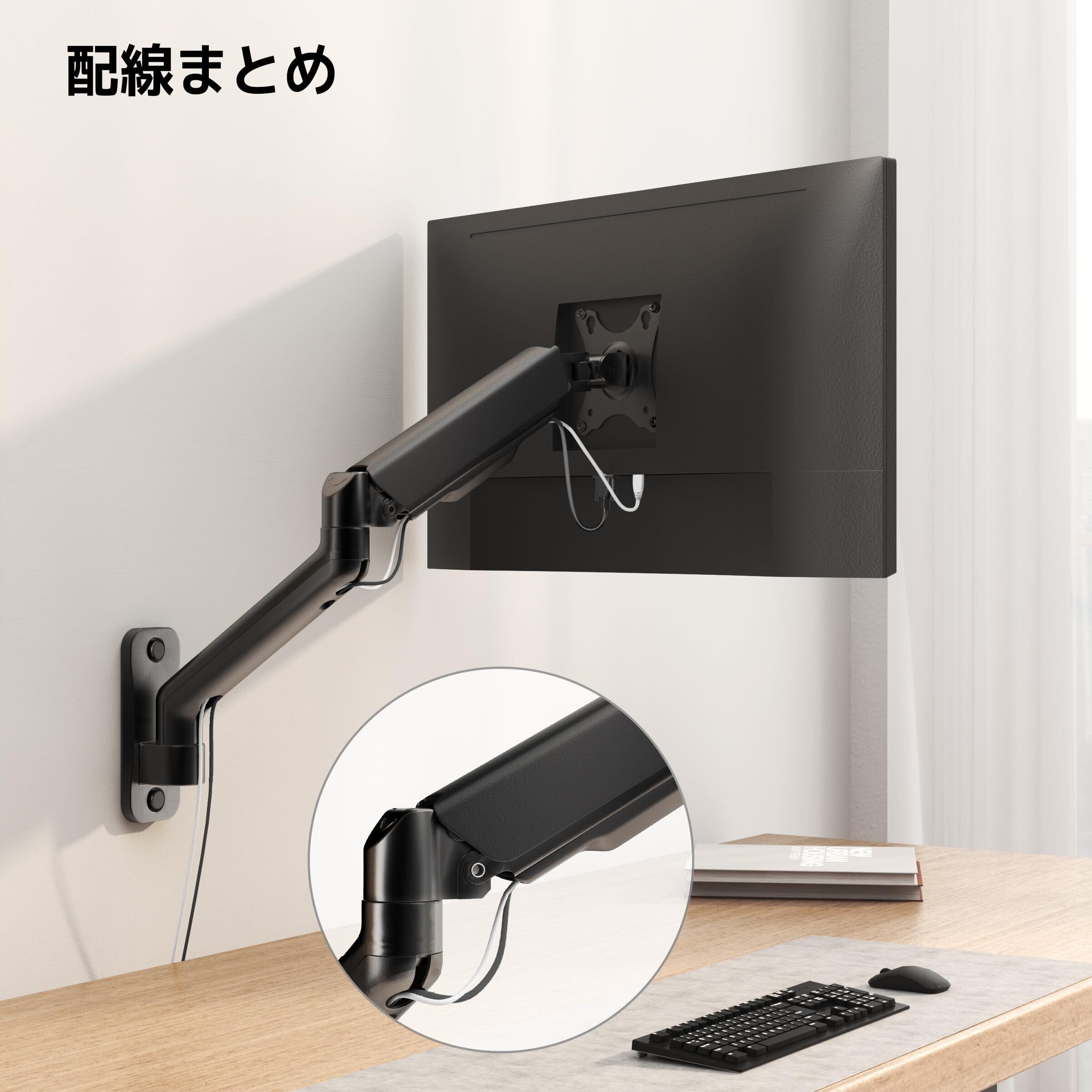 快適な作業環境を提供するだけでなく、スペースの有効活用にも最適なモニターアームです。 商品仕様:13インチから32インチのモニターに対応。VESA規格75mm x 75mm、100mm x 100mmに対応し、最大耐荷重は9kgまで。モニターをしっかりと支えます