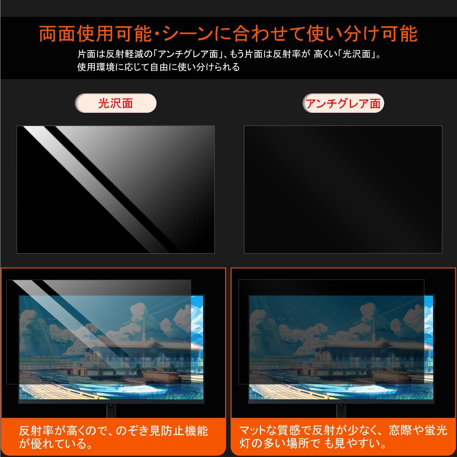 【両面使用可能】片面はアンチグレア加工で太陽や蛍光灯などの光による反射を軽減し、画面を見やすくなります。もう片面は高透過率80%ので、光沢がありますので、覗き見防止効果も高く、画面のツヤも損なわなく、美しく表示します。両面の使用方法は環境や用途に応じて、自由に使い分けることができます。