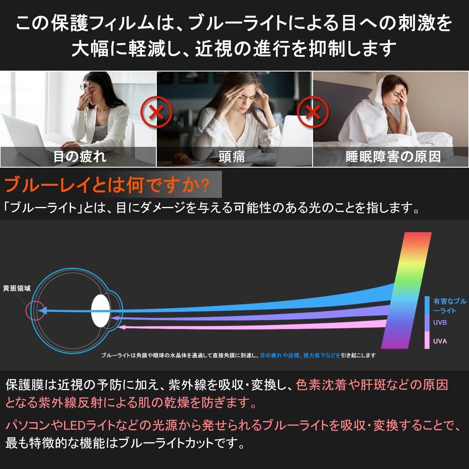 耐久性の高いPET素材を使用し、長期間にわたってしっかりと画面を保護します。ブルーライトを49%カットし、紫外線からも目を保護。仕事やゲームの合間に目の負担を軽減します。