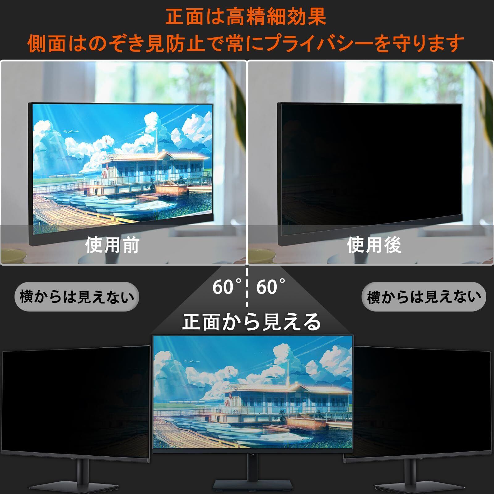 【対応機種】21.5インチ 縦横比16:9。フィルターサイズ:フィルター部分のみ は476×268mm。(縦幅/横幅は誤差+/-1mm程度あります)。【プライバシー保護フィルター】視野角 60度、正面から見ると画面はクリアでも、隣の席からは真っ暗に映る偏光性を有する「覗き見防止フィルター」です。オフィス・カフェ・飛行機・新幹線などにおいて、横からの覗き見を防止でき、安心にパソコンをご利用いただけます。PET素材で作られており、傷や指紋にも強く、長期にわたって優れたパフォーマンスを発揮します。