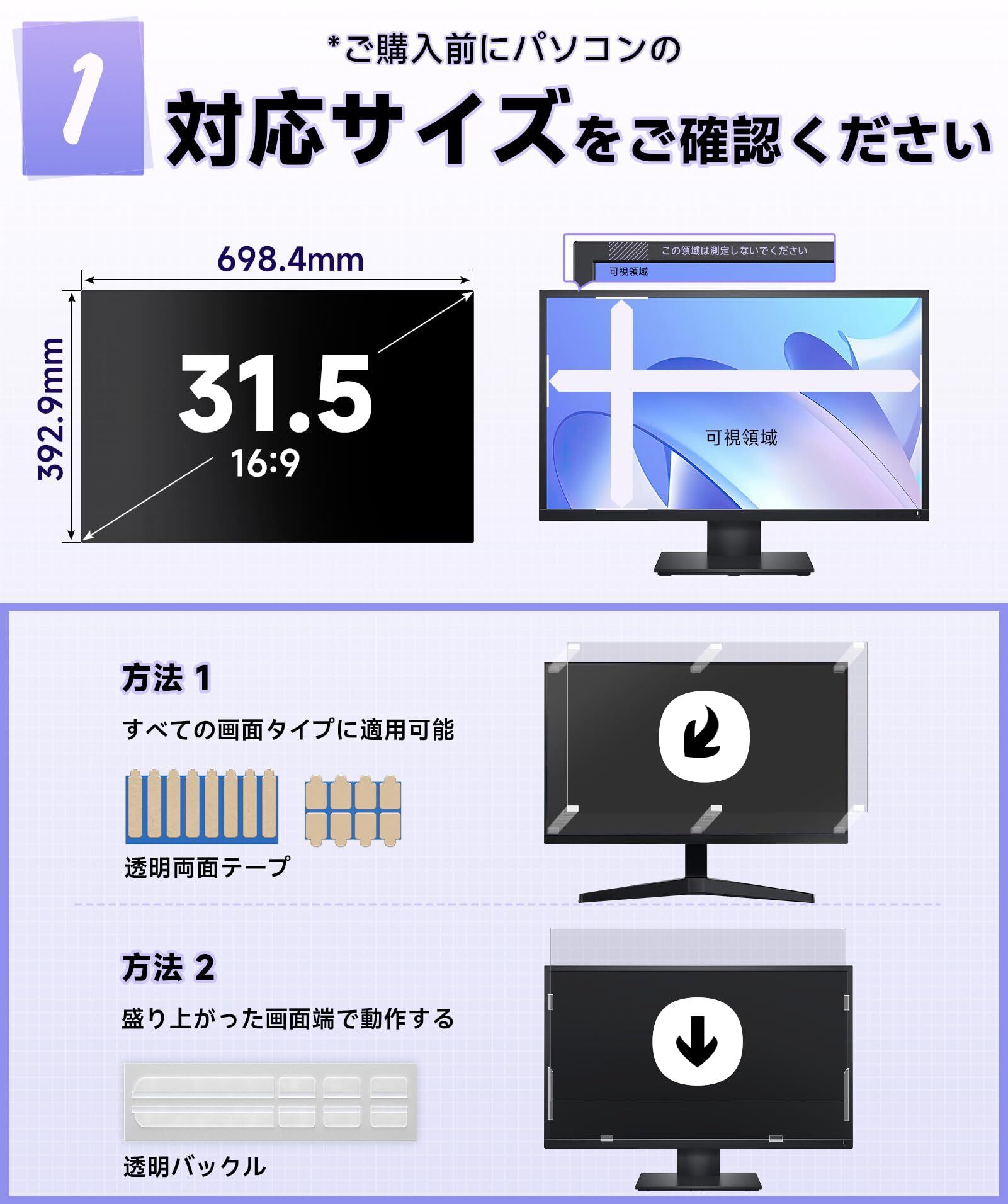【取り付け簡単】 pc のぞき見防止フィルター 31.5インチには2つの独自に設計された取り付け方法があります:①永久取り付け:両面テープ。すべてのコンピュータで動作します。 ②取り外し可能な取り付けとスナップイン取り付け。盛り上がったベゼルを備えたコンピューター用。最適な方法を選択すると、覗き見防止フィルムパソコンを 20 秒でコンピュータ画面に完璧にフィットさせることができます。