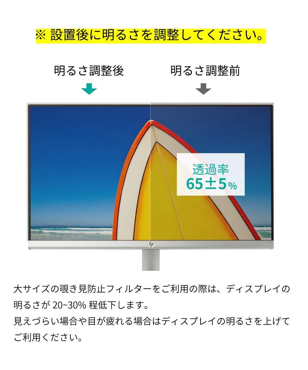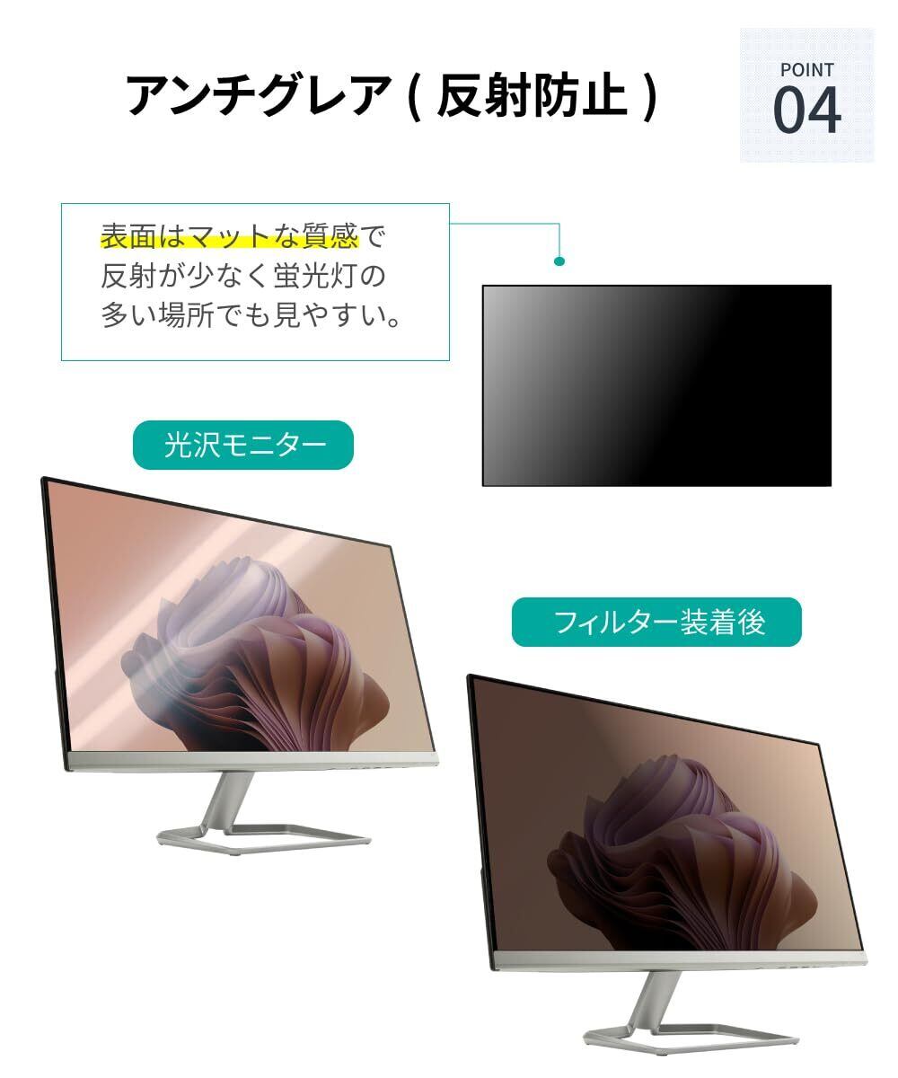 [ アンチグレア ] 本製品はマットな質感のアンチグレア(反射防止・非光沢)仕様で、蛍光灯や室内の光源による映り込みをやわらげます。ただし、モニター本体がすでにアンチグレア仕様の場合に、さらに強い反射防止加工を重ねると、画面が白っぽくなったり見えづらくなることがあるため、あえて過度なアンチグレア加工は施しておりません。そのため、すでに反射防止機能のあるモニターと比較すると、本フィルターの反射防止効果は控えめに感じられることがあります。これは、のぞき見防止機能と視認性のバランスを最適化するための設計です。画面の鮮明さと覗き見防止性能を両立したい方におすすめです。