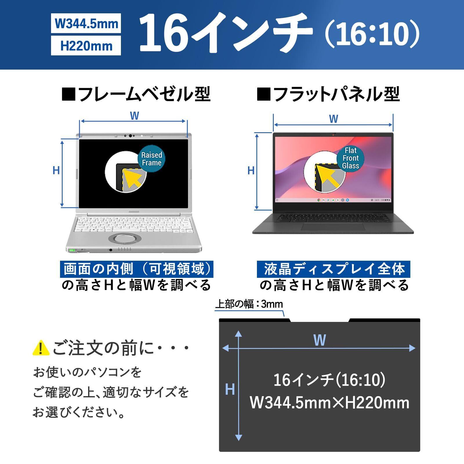 【対応機種】16インチ 縦横比 16:10 寸法:フィルター部分のみ W344.5mm x H220mm (縦幅/横幅のばらつき:+/-1mm程度)。上部の黒いマグネット部分は約3mmなのでフレーム枠が細い機種にも対応しています。
