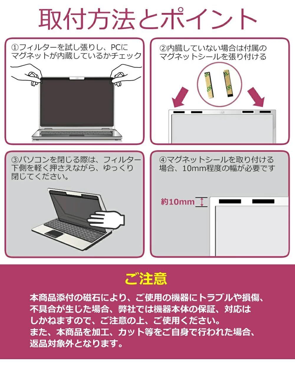 ◆ご購入前の注意点◆※フィルターをずれて取り付けてしまうと、画面(蓋)を閉じた際に液晶画面を破損する恐れがありますので、ご確認の上、画面にぴったりくっつけて取り付けてください 。 ※マグネット付着位置に磁力に反応するセンサーが内蔵されている一部の機種は、ご利用頂けない場合がありますが、マグネットの位置の微調整によりご使用可能になる場合がございます。お確かめの上ご利用下さい。※この商品は汎用品になります。ご使用されている機種によっては、装着したままの状態では蓋を閉めることが出来ない場合がございます。※保護フィルムは、液晶画面表示領域のみをカバーする仕様で全面をカバーする仕様ではございません。※タッチパネル操作やタッチペンには対応しない仕様です。