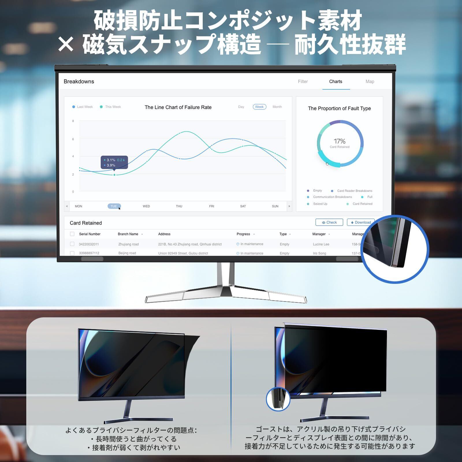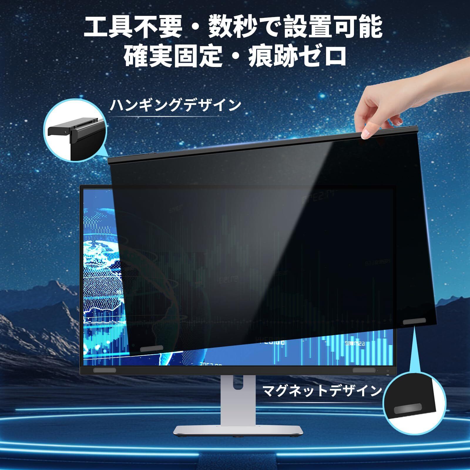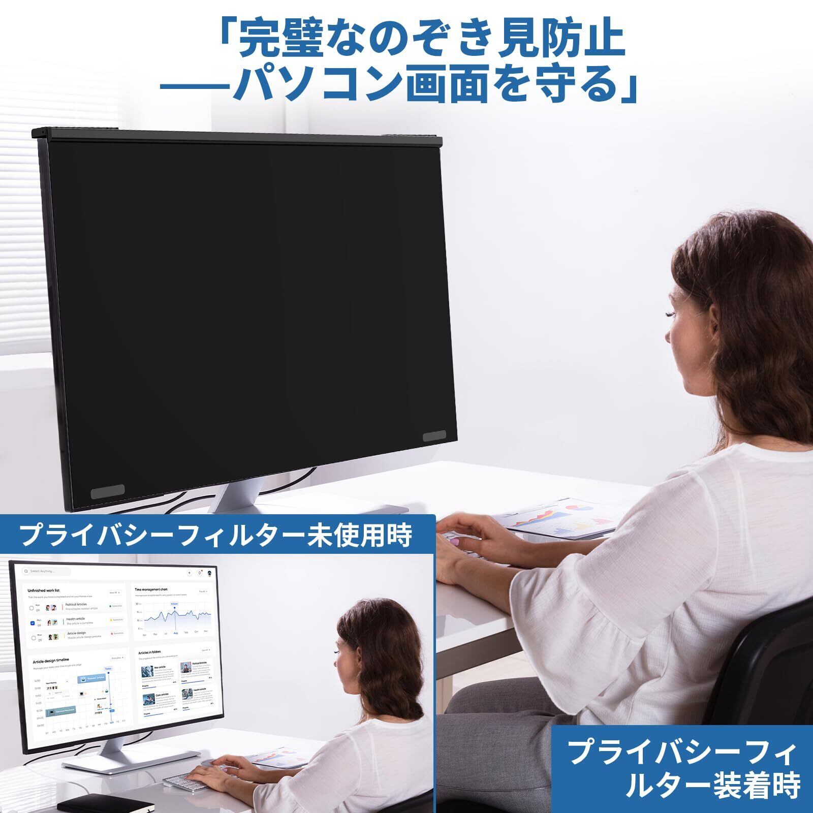 マグネット式プライバシー画面保護フィルター - たった2ステップで設置可能!位置合わせしてカチッとはめるだけ!強力マグネットエッジで24インチモニターにぴったり固定(接着剤不要・剥がしても跡残りなし/「簡単取り付け防窥フィルター」に最適)。再利用可能な設計で、オフィスやコワーキングスペースでの作業中はスパイ防止対策として装着し、プライベートタイムでは外してクリアな視界を確保
