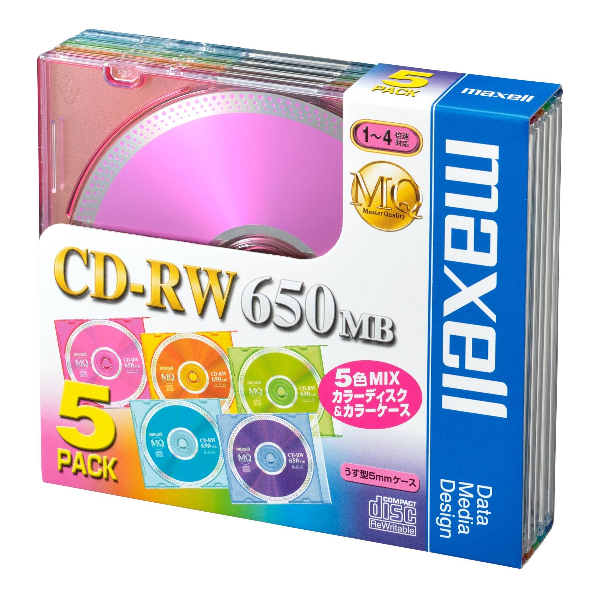 maxell データ用 CD-RW 650MB 4倍速対応 カラーMIX 5枚 5mmケース入 CDRW74MIX.1P5S
