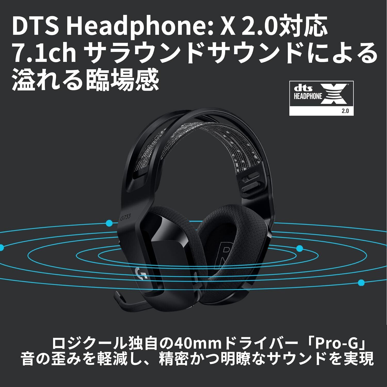 ロジクールG 独自の「Pro-G」ドライバー/40mmの大口径で音の歪みを軽減しクリアなサウンドを実現/ゲームの立体音響を精確に表現するバーチャルサラウンドサウンド技術「DTS Headphone:X 2.0」にも対応/迫力のある音、わずかな物音や音のする方向まで表現 ※DTS Headphone:X 2.0はパソコンでの利用時に対応