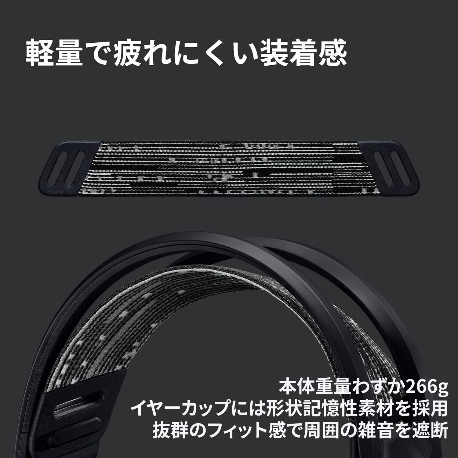 本体重量は266gとロジクールGのゲーミングヘッドセットの中でも軽量です。ヘッドバンドにはリバーシブルで使えるサスペンションバンドを使用し、イヤーカップには形状記憶性の素材を採用しました。頭を振ってもズレにくく、周囲の雑音を遮断するほどのフィット感と、長時間使用しても疲れにくい装着感を両立しています。