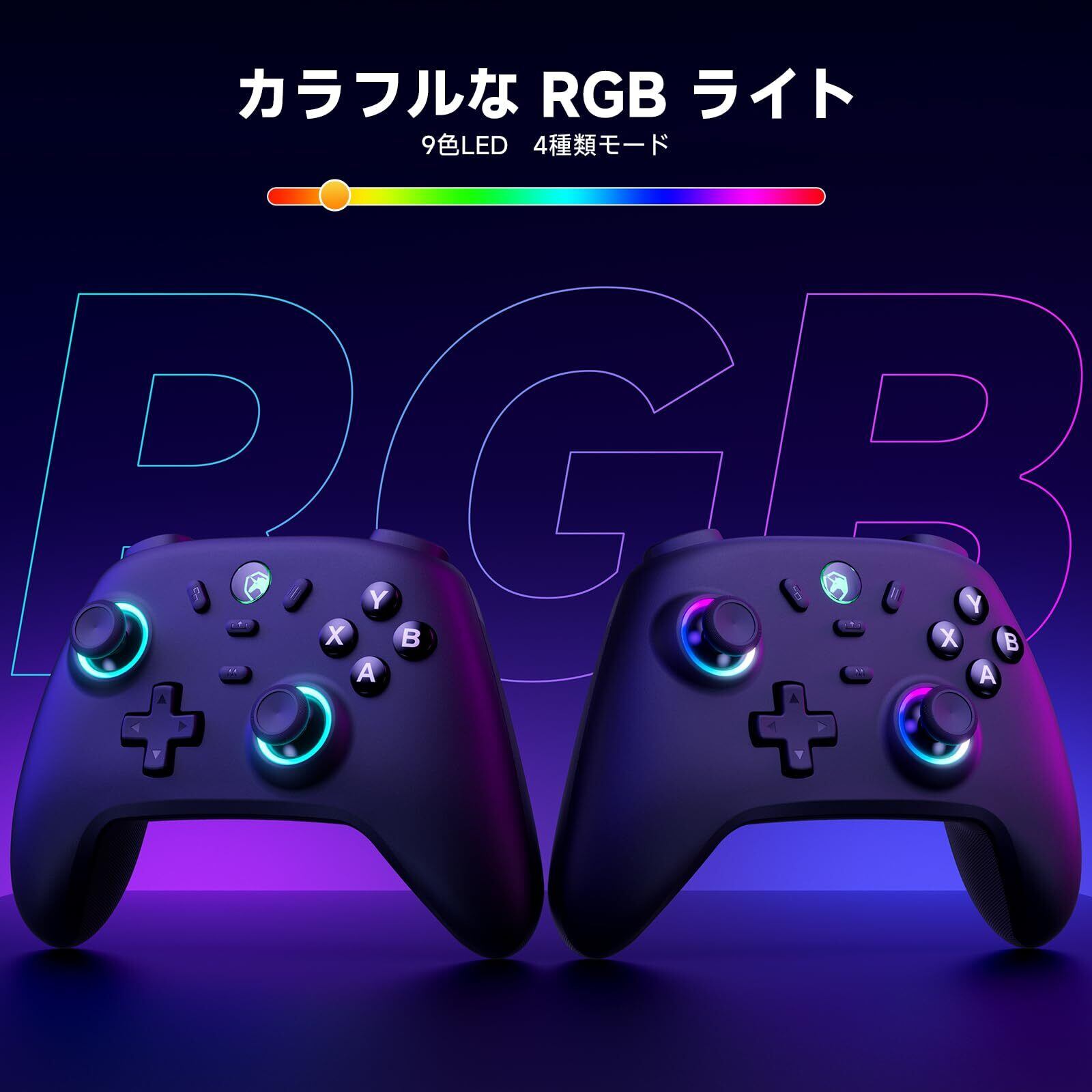 【カラフルなRGBライト】RGBライトを搭載した無線コントローラーです。アナログスティックの周りにLEDを内蔵しており、9色に光らせることができます。LEDのカラーと光り方は調整が可能で、お気に入りのカラー1色に固定した「単色モード」や、LEDのカラーが徐々に変わっていく「呼吸モード」など、自分好みに設定できます。