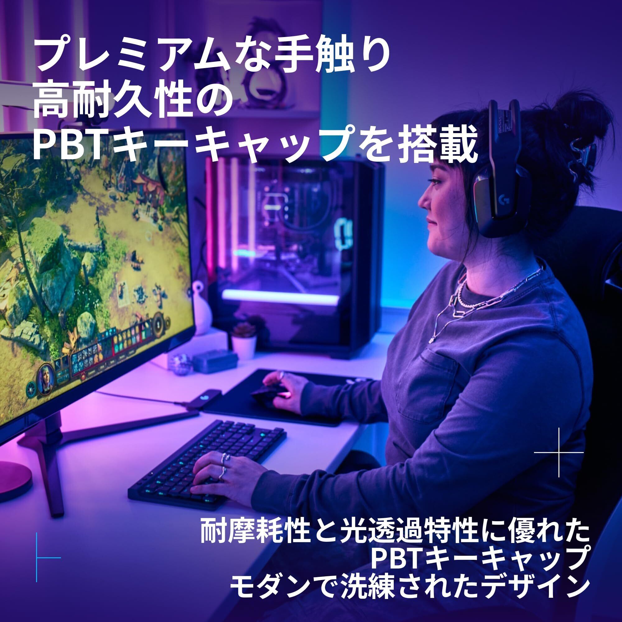 耐摩耗性に優れ、光透過特性を向上させる高品質な薄型PBTキーキャップを採用/静かなタイピングを提供する「リニア」スイッチ(赤軸)を搭載/プレミアムな手触り、高いパフォーマンスとモダンで洗練されたデザインを実現