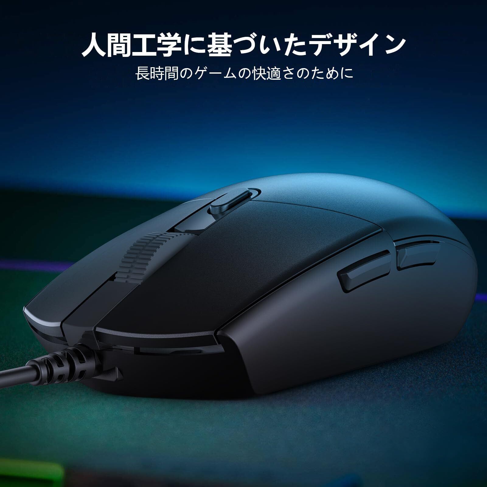 4段階のDPI設定(1000/1600/3200/6400)は、瞬時に感度を調整でき、さまざまなゲームスタイルに合わせた精密な操作が可能です。マウス自体も軽量かつ快適な握り心地を提供します。