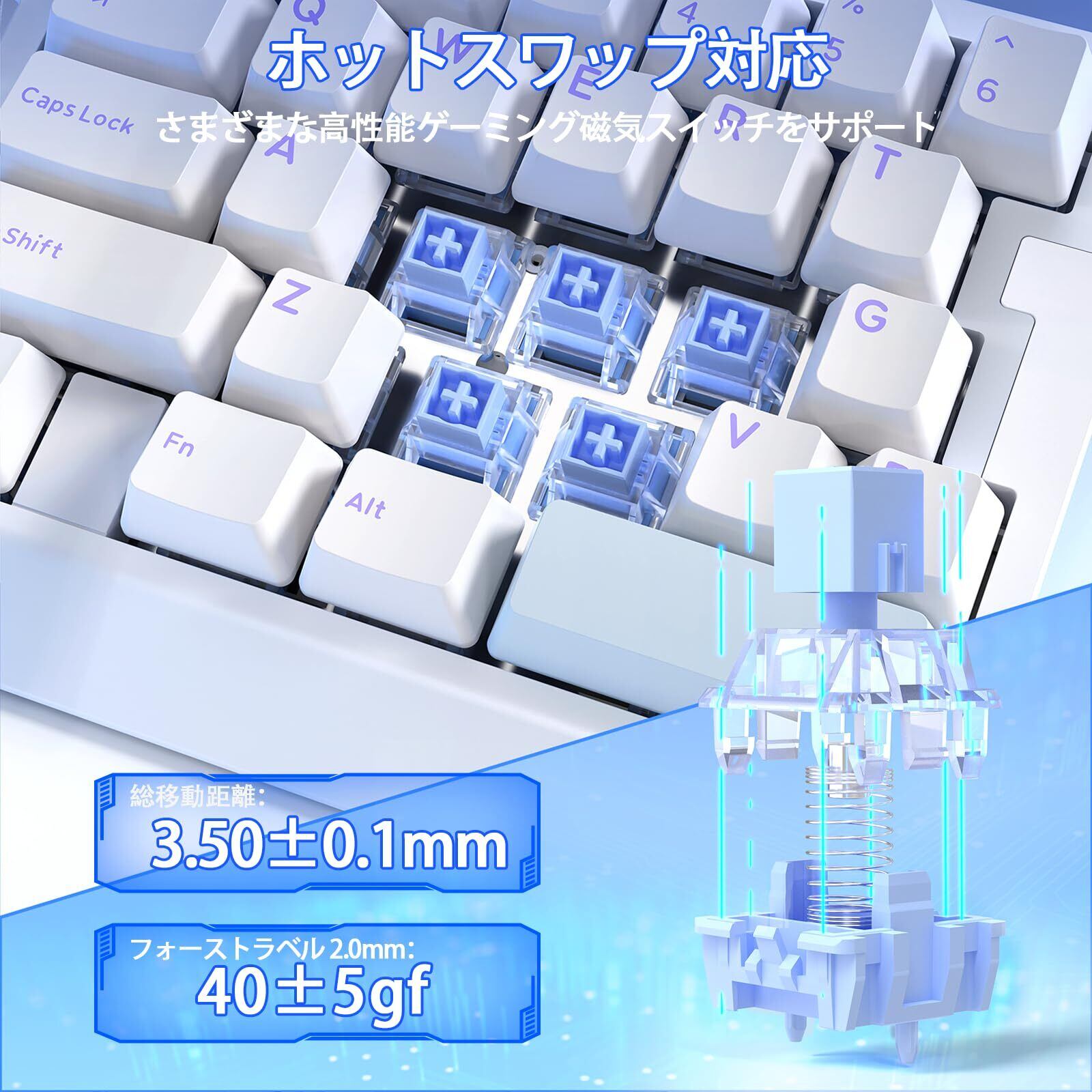 磁軸スイッチを搭載し、軽快で安定した打鍵感を実現。アルミニウム合金プレートにより、剛性感も高く、長期間使用しても耐久性に優れています。また、5層の消音構造で静かな環境でも快適に使用できます。