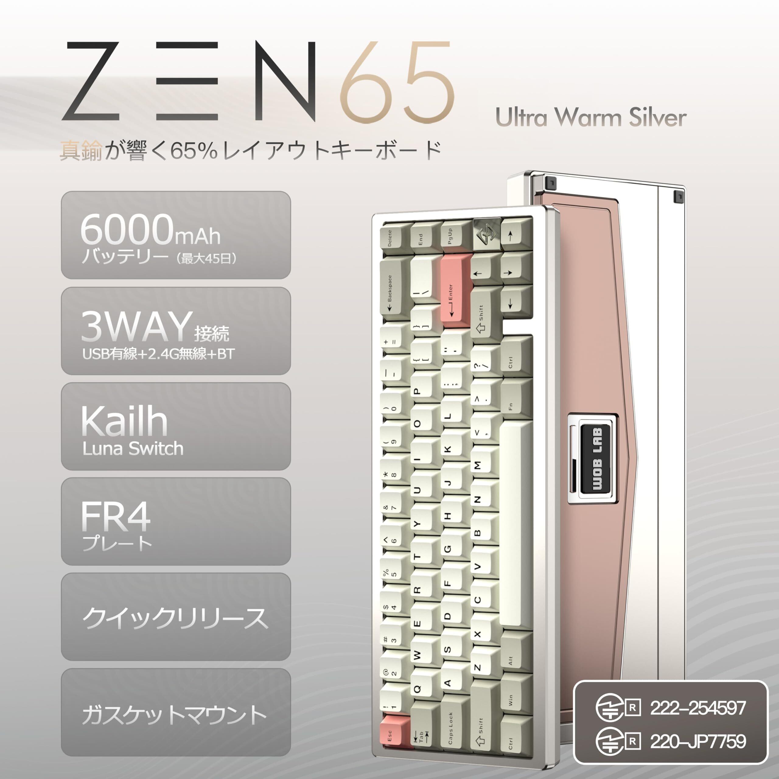 WOBKEY ZEN 65 メカニカルキーボード|3WAY接続|クイックリリース|無線・ワイヤレス|65% US英字配列/JIS日本語配列|金属・アルミ合金・真鍮|低遅延|カスタム|トップマウント|ガスケットマウント|ARGB|ホットスワップ対応|国内正規品【技適認証済み】(Ultra Warm Silver)