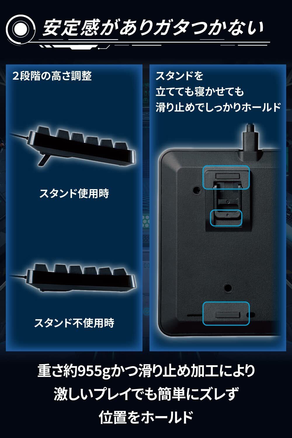 ■テキスト入力とゲームプレイのしやすさを両立させるため、プレイヤー同士のチャットなど、日本語入力もスムーズに行えるよう、半角全角キーや方向キー、Deleteキーを搭載し、スペースキーを広くとった日本語環境のプレイヤーに最適な配列です。