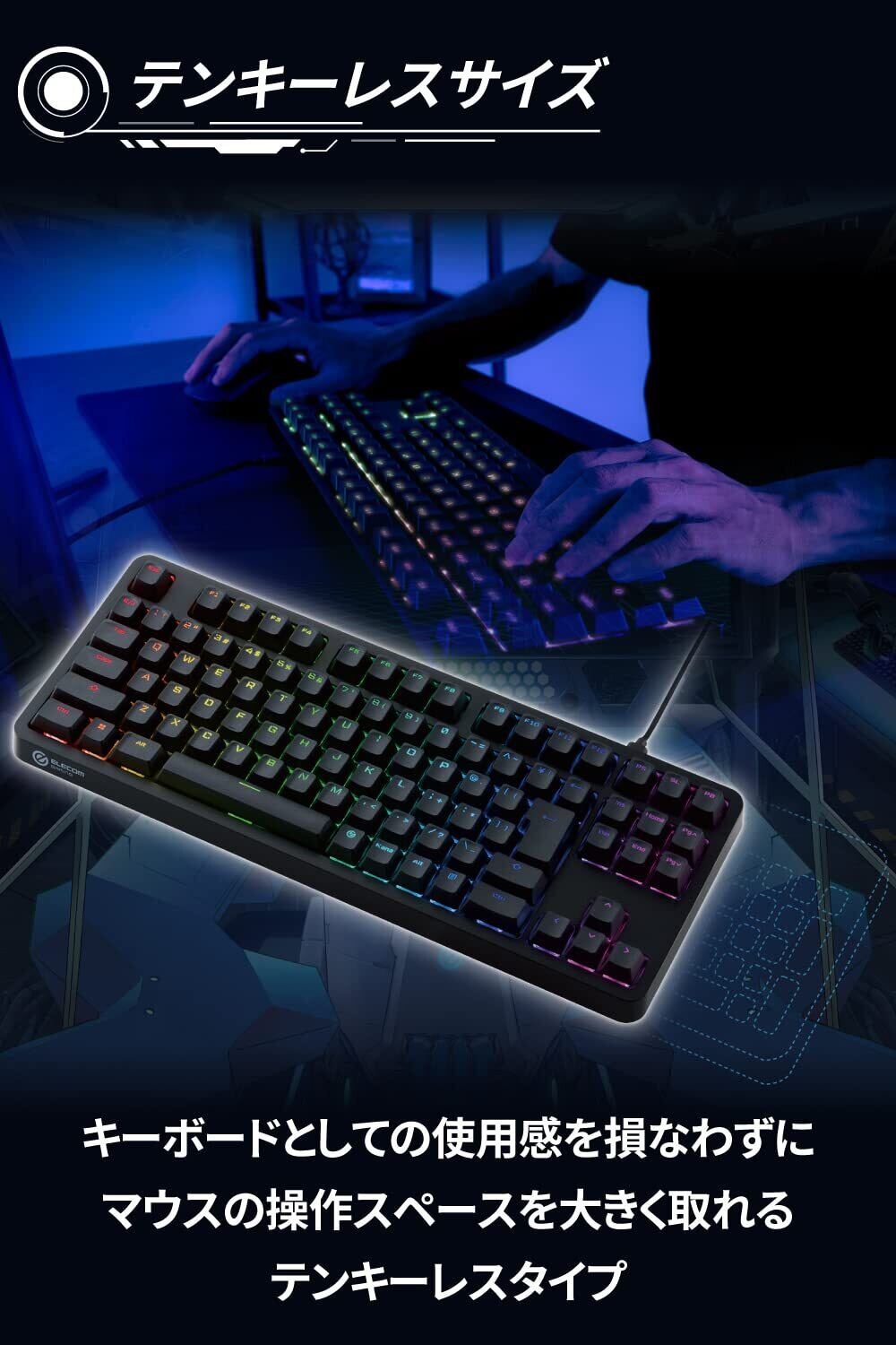 ■デスク上でマウスの操作スペースを多く確保できるテンキーレスサイズです。