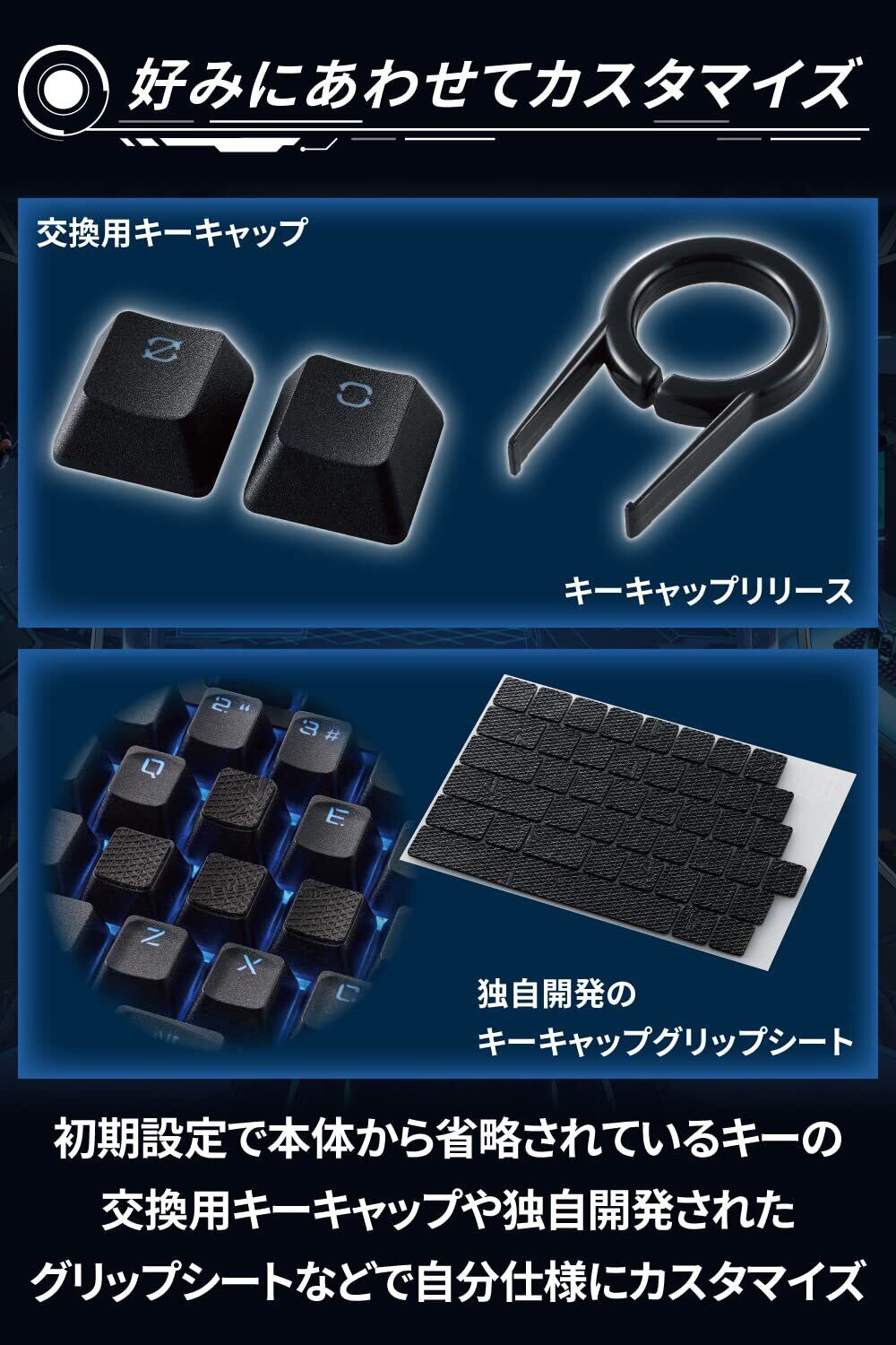 ■キーボードを操作する指の僅かな滑りも許さない極限を追求するプレイヤーのため、独自開発の“キーキャップグリップシート"を付属しています。