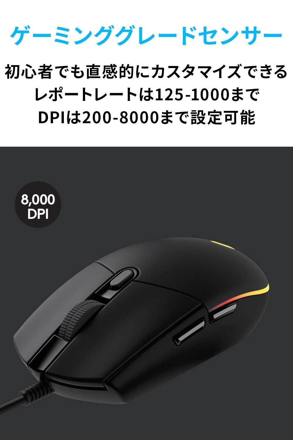 【Logicool G G203 有線ゲーミングマウス】8,000DPIの高性能センサーを搭載したG203はエントリー向け高性能ゲーミングマウス。85gの軽量本体と柔軟に絡みにくいケーブルで激しくマウスを動かしくてもストレスにならない。