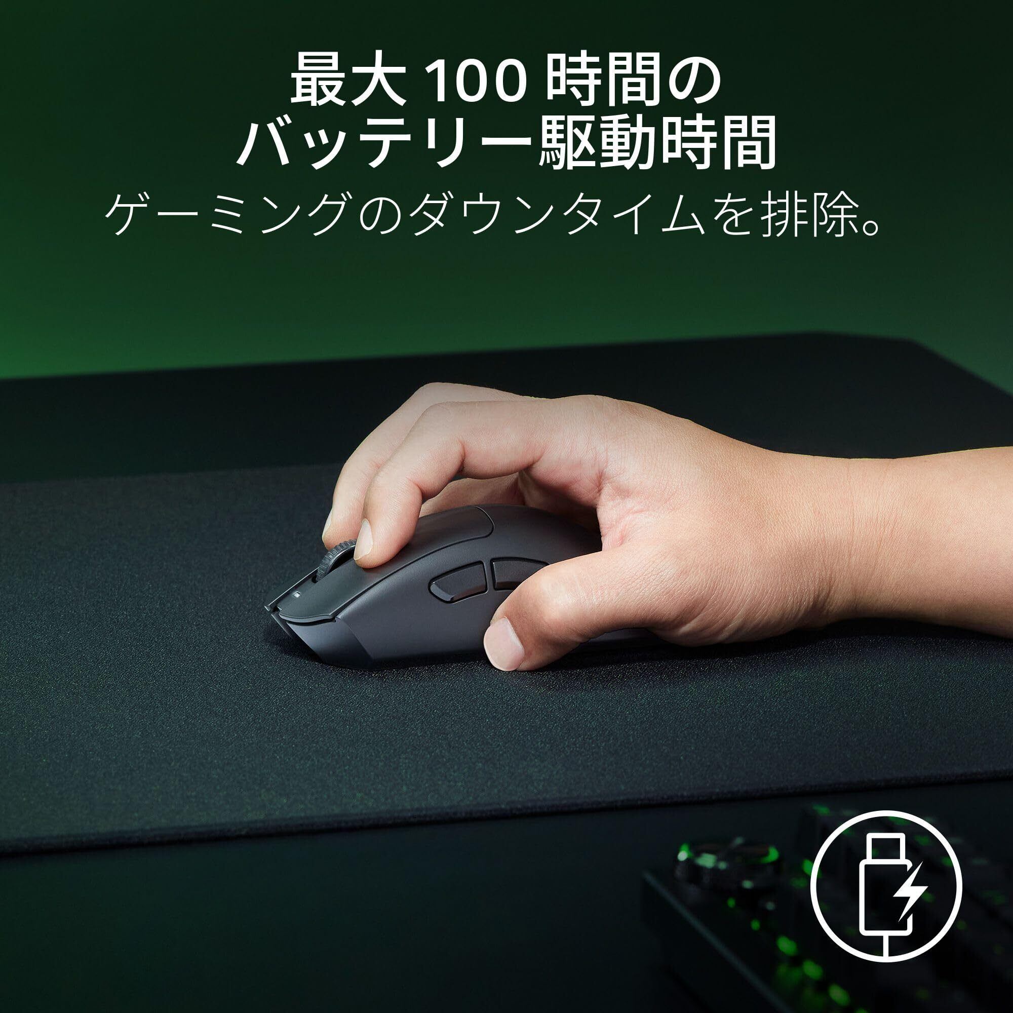 【100 時間のバッテリー駆動時間 - ゲーミングのダウンタイムを排除。】 USB Type C 充電設計により、白熱したゲーム競技や大会でも、100 時間の高パフォーマンスのゲームプレイを続けることができます。