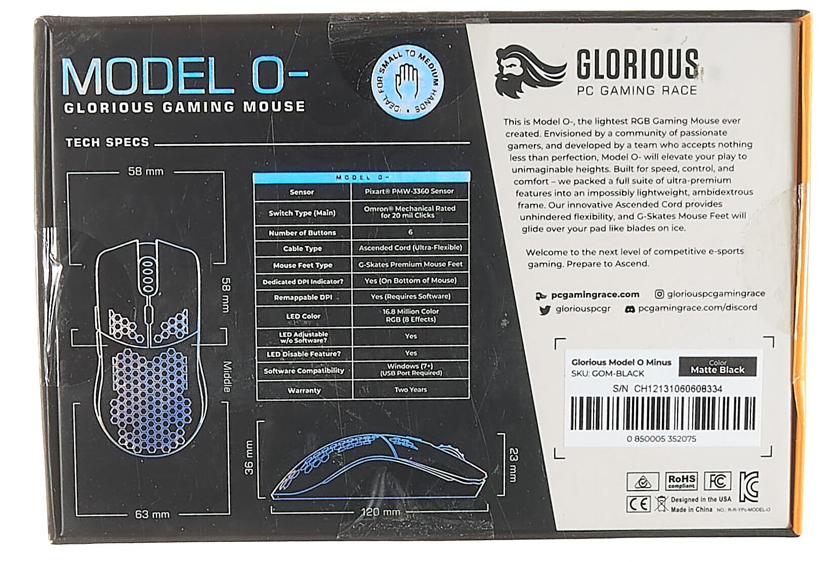 サイズとスタイル: ゲーミング用両手対応軽量マウス。スピード、コントロール、快適性を追求し、最適な重量と高い耐久性を実現。Model O- (Minus) は中~小さな手に最適。