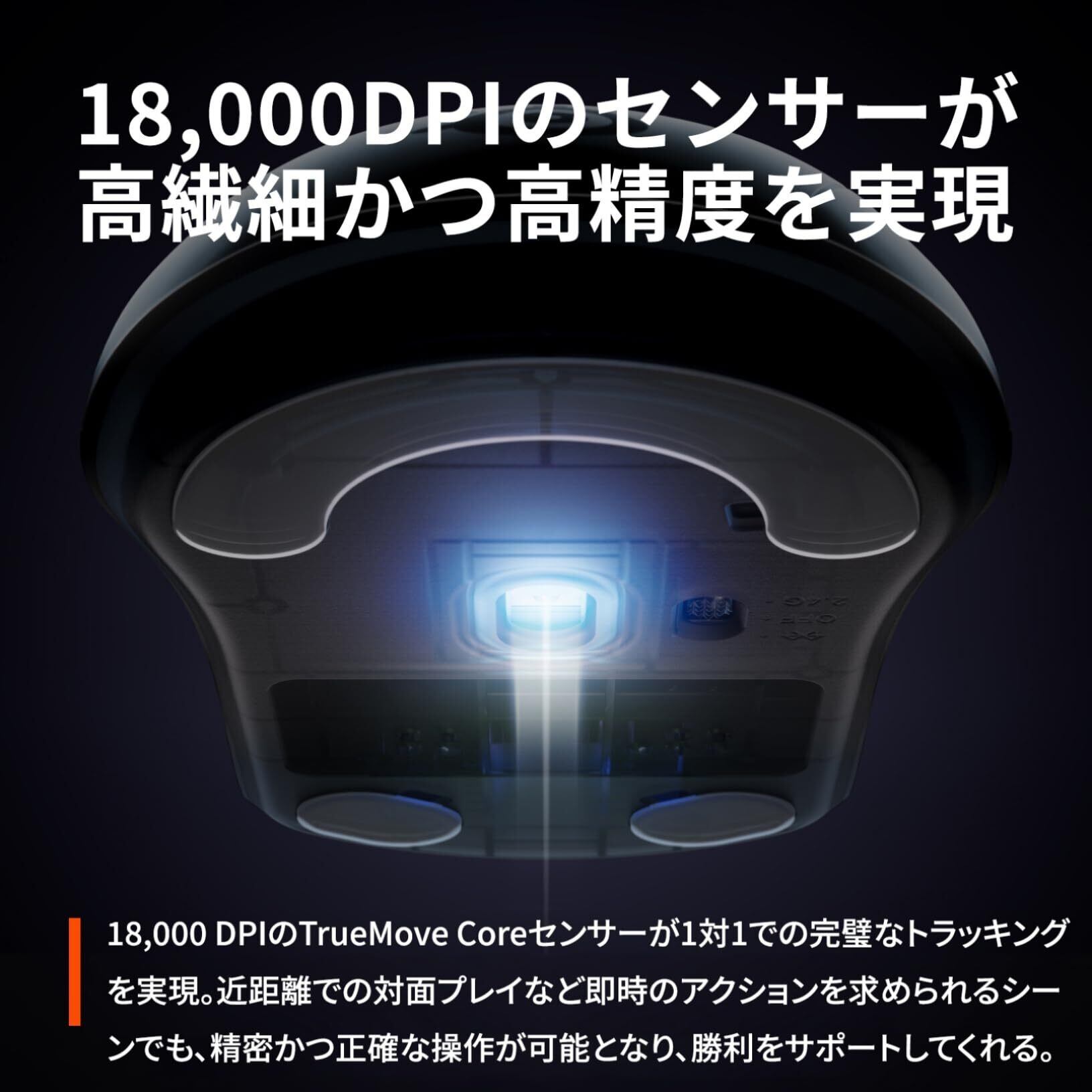 【18,000DPIのセンサーが高繊細かつ高精度を実現】18,000 DPI の True Move Core センサーが1対1での完璧なトラッキングを実現。近距離での対面プレイなど即時のアクションを求められるシーンでも、精密かつ正確な操作が可能となり、勝利をサポートしてくれる。