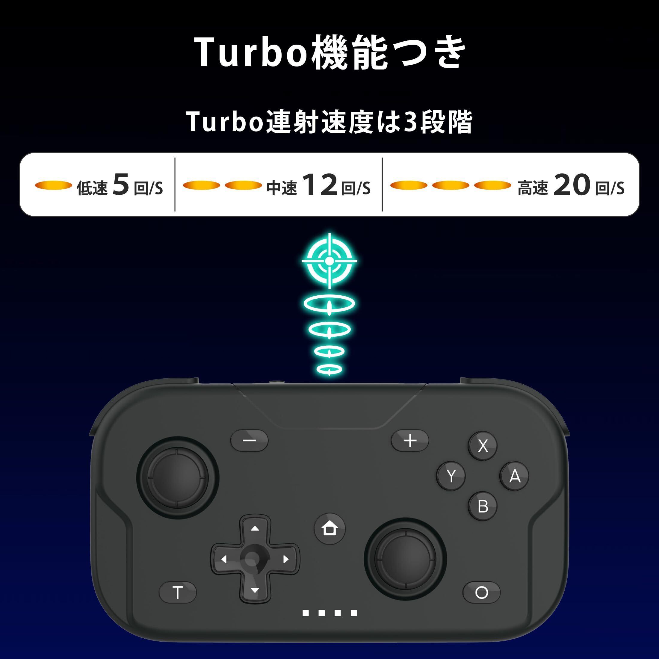 コントローラーに備わるTurbo機能により、ボタンを一度押すだけで連打が自動化されます。これにより、アクションやシューティングゲームなどでもストレスなく快適に操作できます。