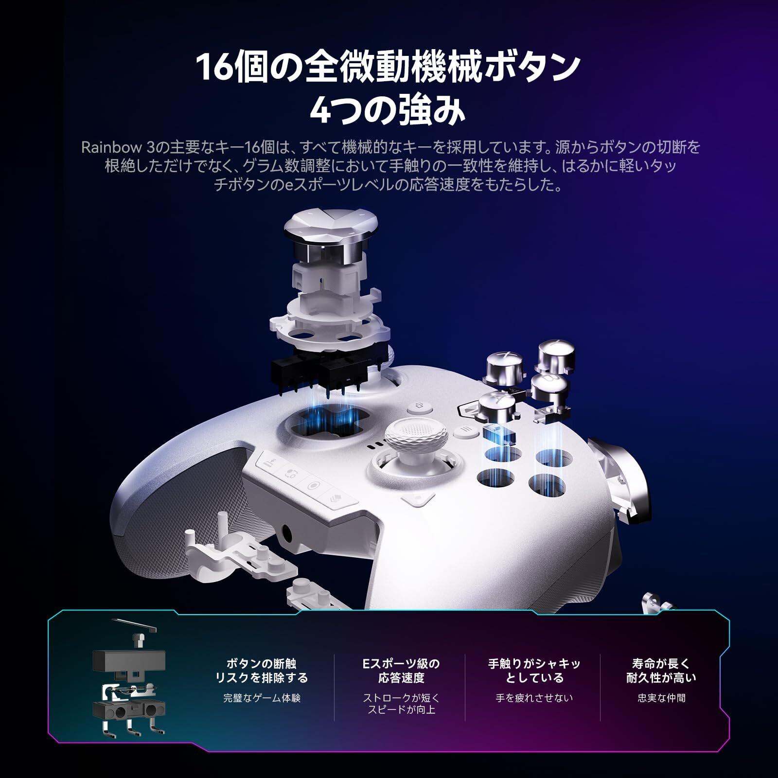 【多機能三モードゲーミングコントローラー】おすすめのRainbow 3ワイヤレスコントローラー:カスタム静電容量ジョイスティック、8000段階の解像度、2000Hzポーリングレート有線/無線接続、1000Hz高精度6軸ジャイロスコープ、16個のメカニカルマイクロスイッチ、14個の独立RGBライト、ホール/マイクロのデュアルトリガー、双方向非対称モーター、人間工学に基づくデザイン、サスペンション式マグネットベース、3.5mmワイヤレス音声、アダプティブキャリブレーション機能、ターボ、マルコ、255レベル調整可能な振動、Hブリッジチップ、アンチデッドゾーンアルゴリズム、キーボードマッピング、スクリーンショット、3セットのジョイスティック、4方向および8方向の方向パッド、ELITEアプリ4.0。PC Windows/Android/iOS/Switch/Switch2プラットフォームに対応。