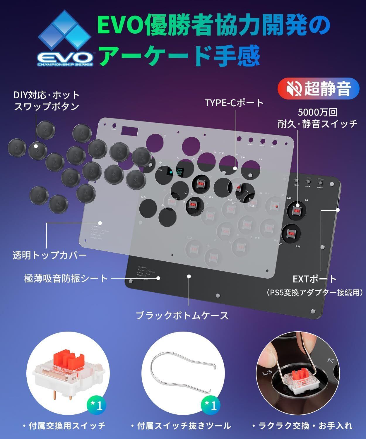 【超低入力遅延・デュアルコア高性能チップ・超薄型静音スイッチ】このレバーレス コントローラーはコアハードにRaspberry Pi RP2040デュアルコアARM-M0プロセッサを採用し、遅延<1msでフレーム抜け率98%以上を確保。5000万回耐久のホットスワップ対応ショートストロークスイッチは超薄静音設計で。このアケコン レバーレスはトッププレート着脱式でスイッチ交換が容易、フルカラーバックプレートやDIY用白プレートも簡単に交換可能。