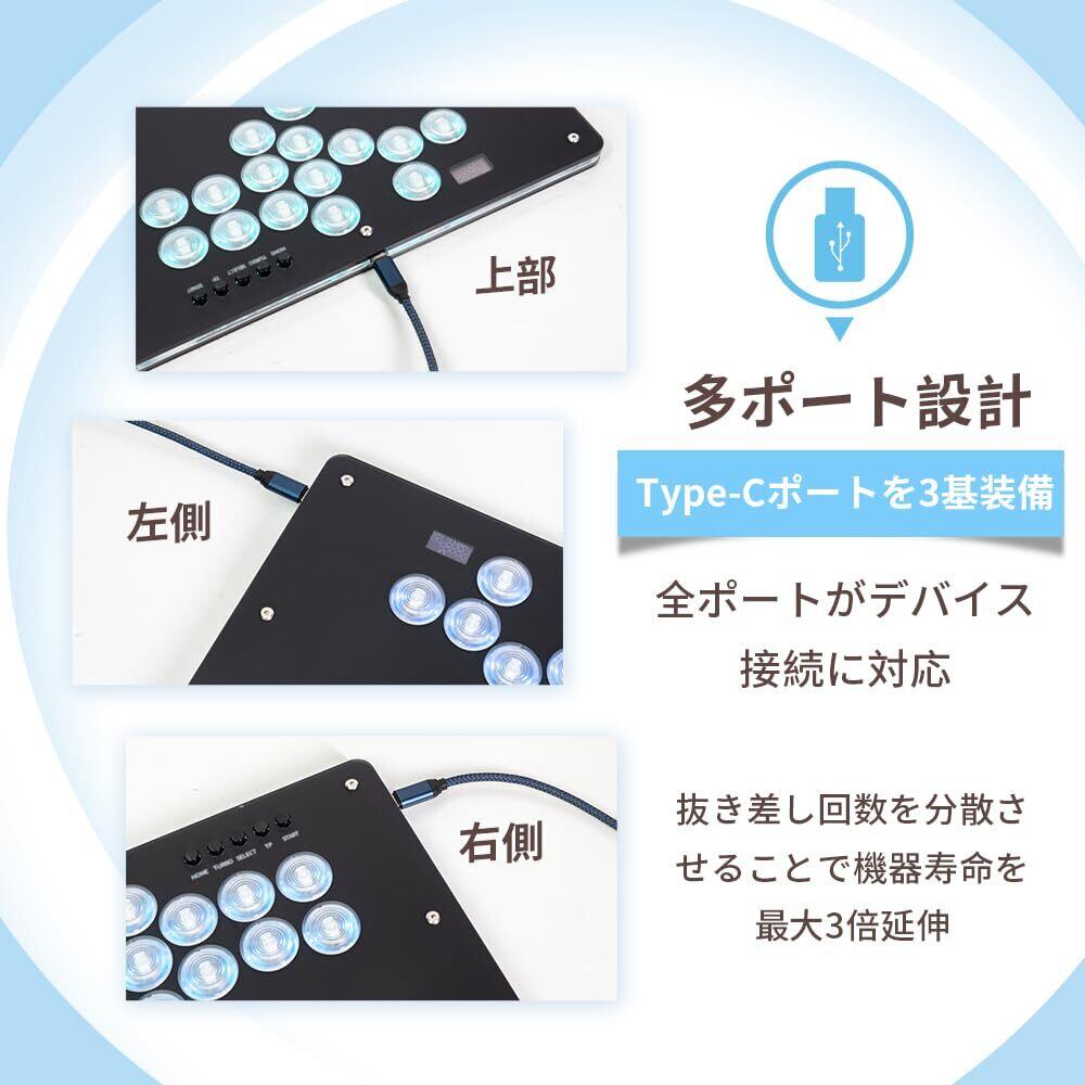 【接続、設定&同梱内容】 ① 【接続】 デバイスに接続する際は、対応するデバイスのボタンを押しながら接続してください。 ② 【設定】 Web設定は、本製品をパソコンに接続した後、すべての関連設定を開始できます。STARTボタンを押しながらPCに接続してください(データ転送に対応したUSBケーブルを使用してください)。OLEDディスプレイにWeb設定モードが表示されれば、Google Chromeで「192.168.7.1」を入力して設定を開始してください。 ③ 【同梱内容】 製品サイズは300×200×14mm、重量は960gです。膝に載せるのに適しています。T16格闘ゲームコントローラー(16ボタン)、USBケーブル、軸体、スリップガード、L字六角レンチ、日本語取扱説明書が同梱されています。