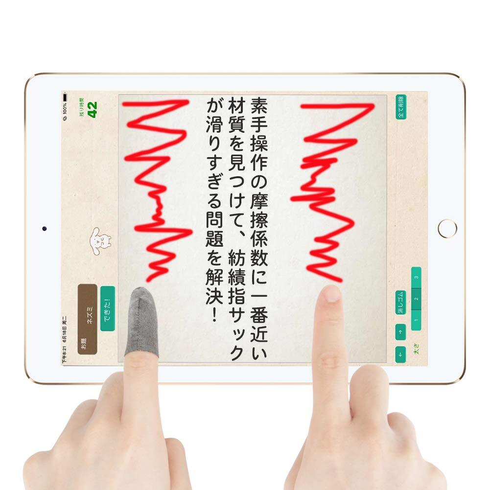 【爪先には縫い目なし】より快適なゲーム体験のために、百種以上の縫製方法を試しました結果、「1」字型の結び目や結び目なしの指側面が縫い目あるタイプなどの作り方をやめて、「米」に似ている結び目を決めました。この結び目で指先の周りの余裕な布を集中した同時、爪先の縫い目を避けて画面に触れる面をすべて滑らかでシームレスにしました。iPadで4/5/6/8本指操作する時は指の側面扉の間で操作しても違和感がありません。また布の表面が全て高感度の導電性繊維で覆われ、指先、指腹や指の側面は全て反応します。細かな操作や連打、スムーズな動きをできる同時に、反応と操作体験も良くなります。