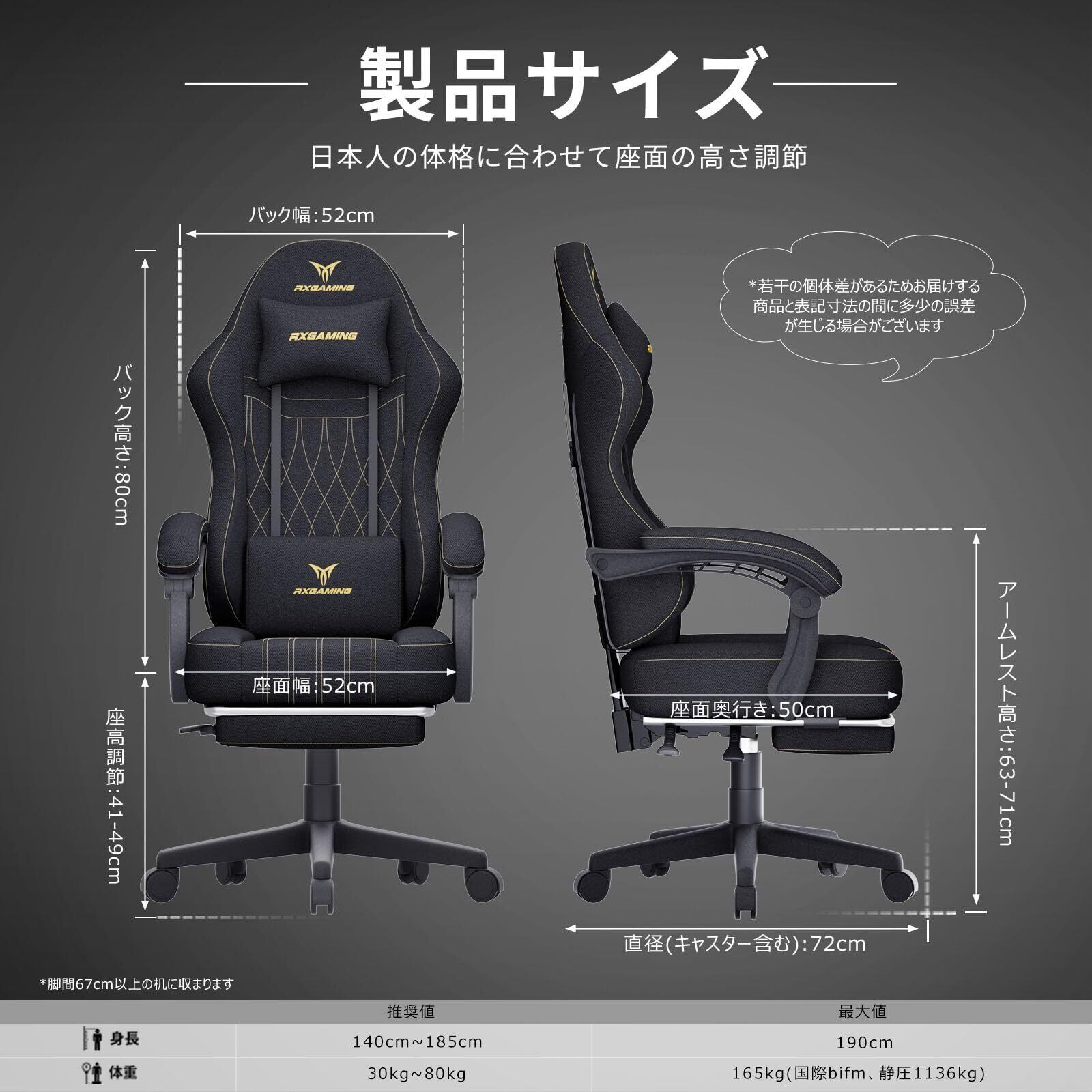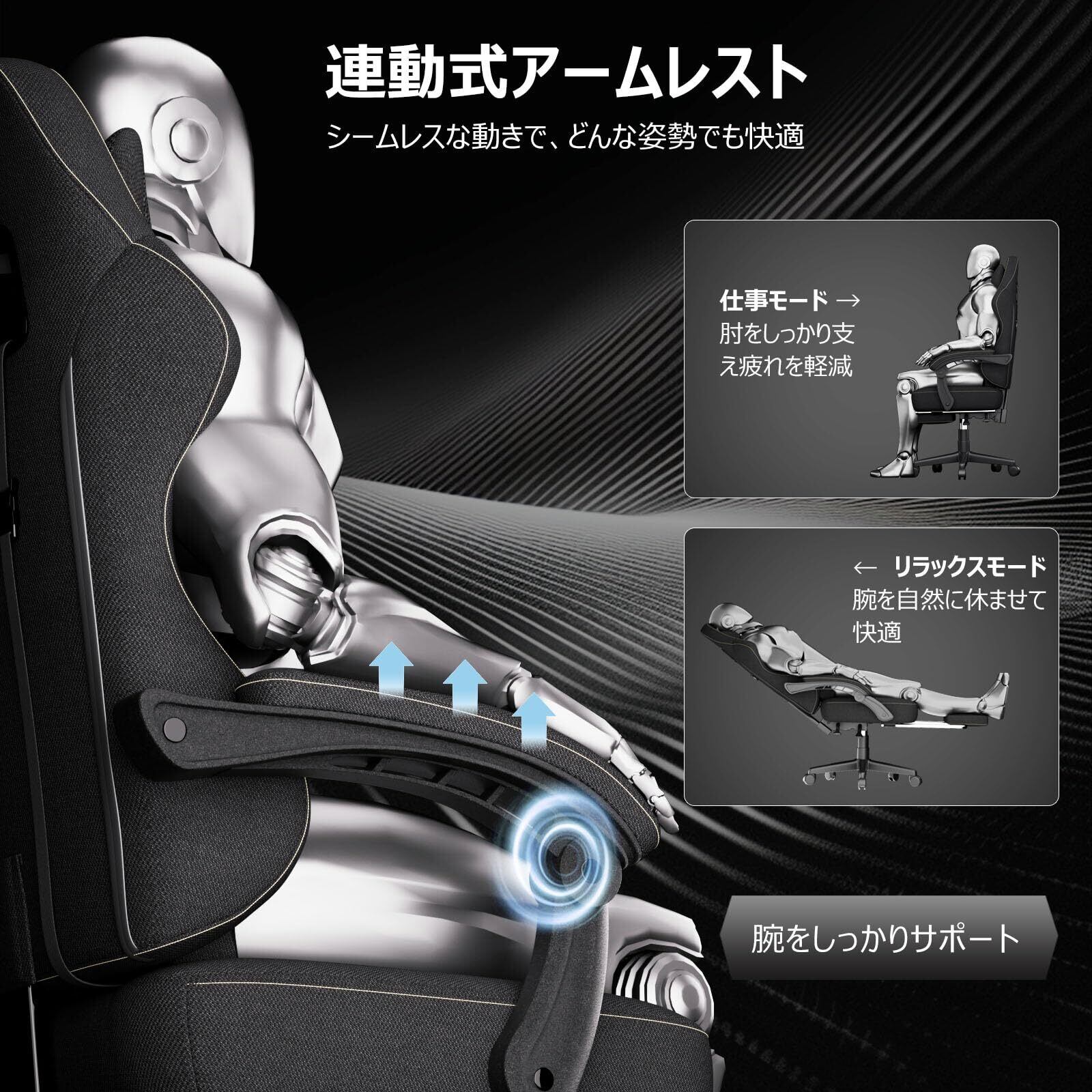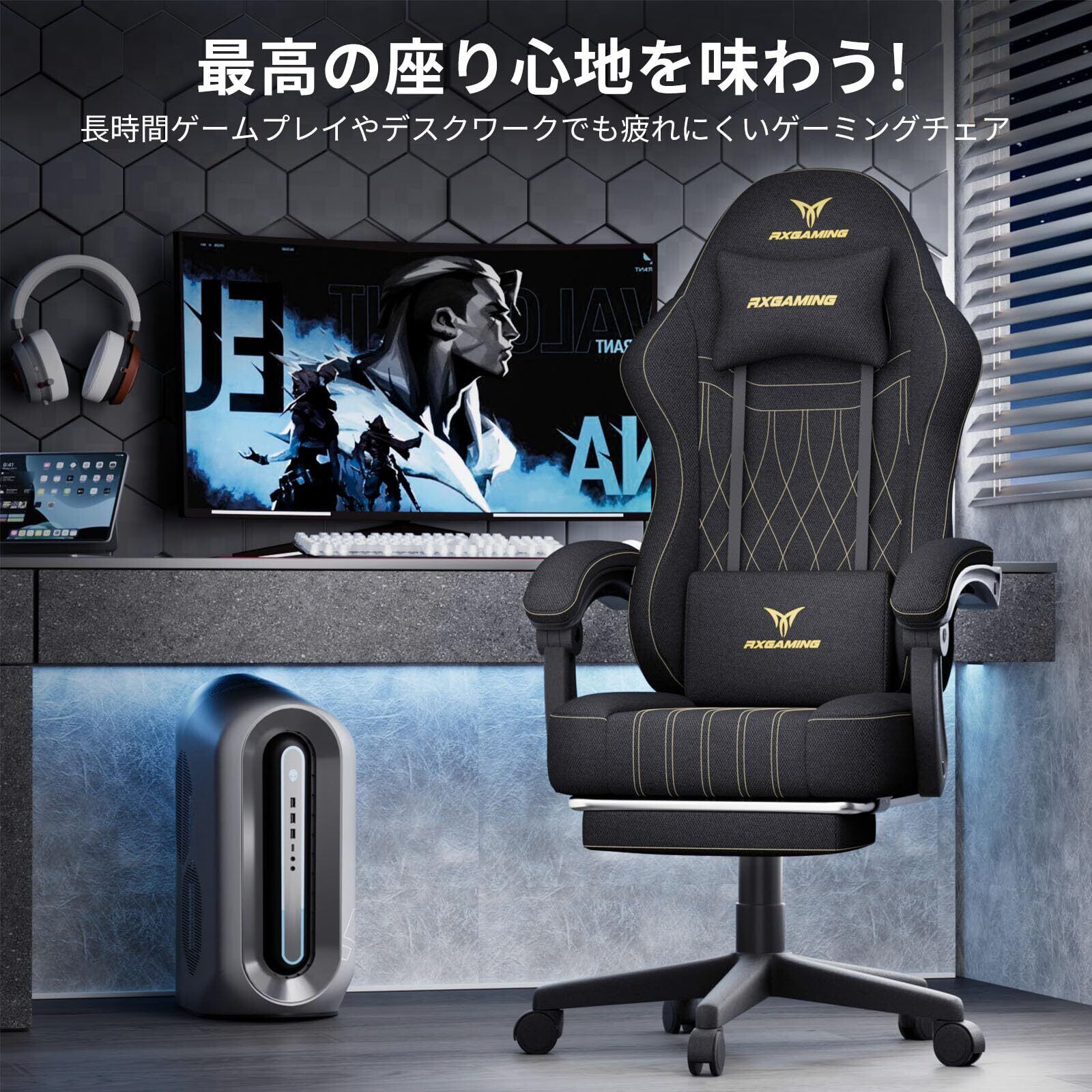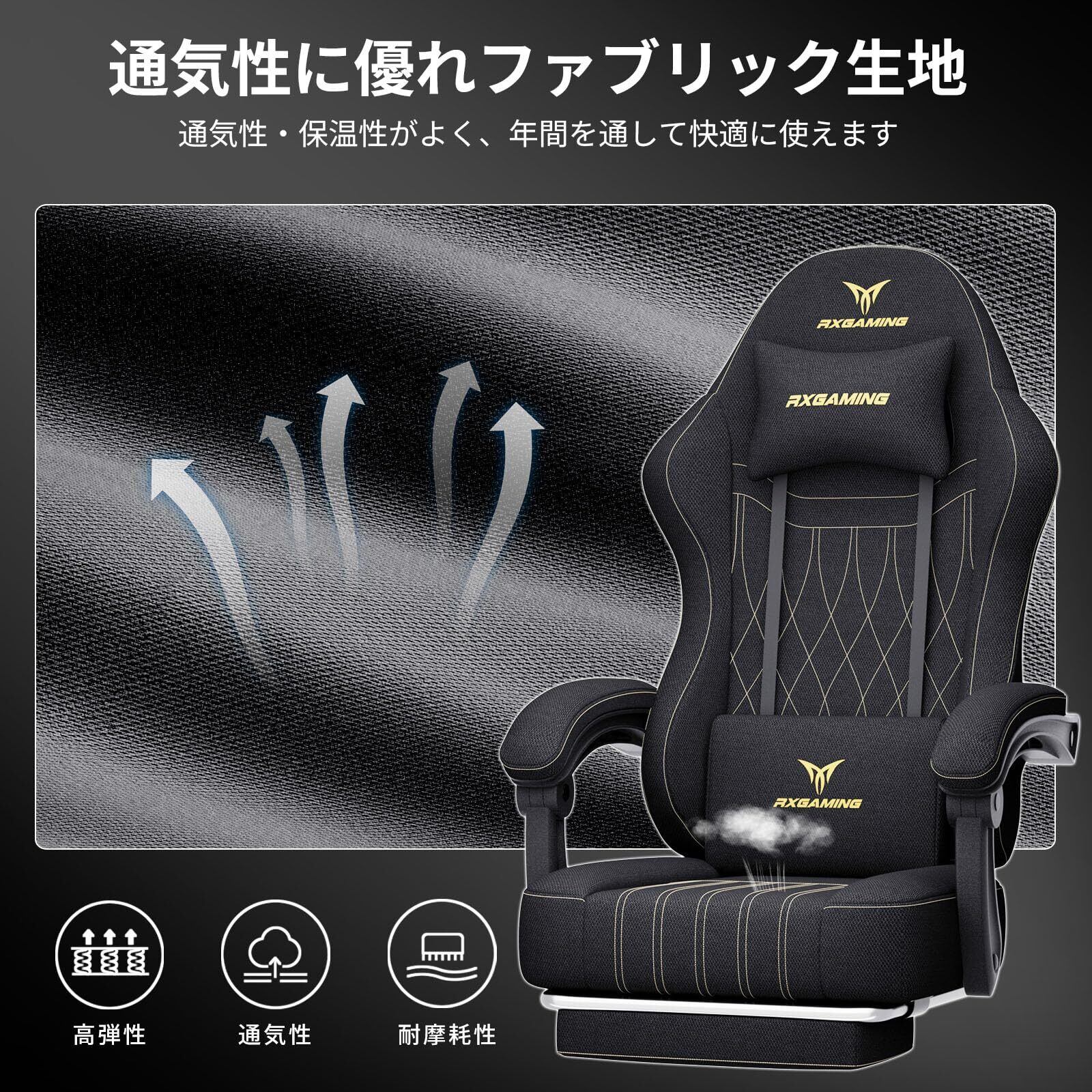 RXGAMING ゲーミングチェア オフィスチェア イス 椅子 テレワーク 疲れない ファブリック デスクチェア オットマン付き ゲーム用チェア145°リクライニング パソコンチェア 座り心地よい テレワーク 収納便利 ブラック