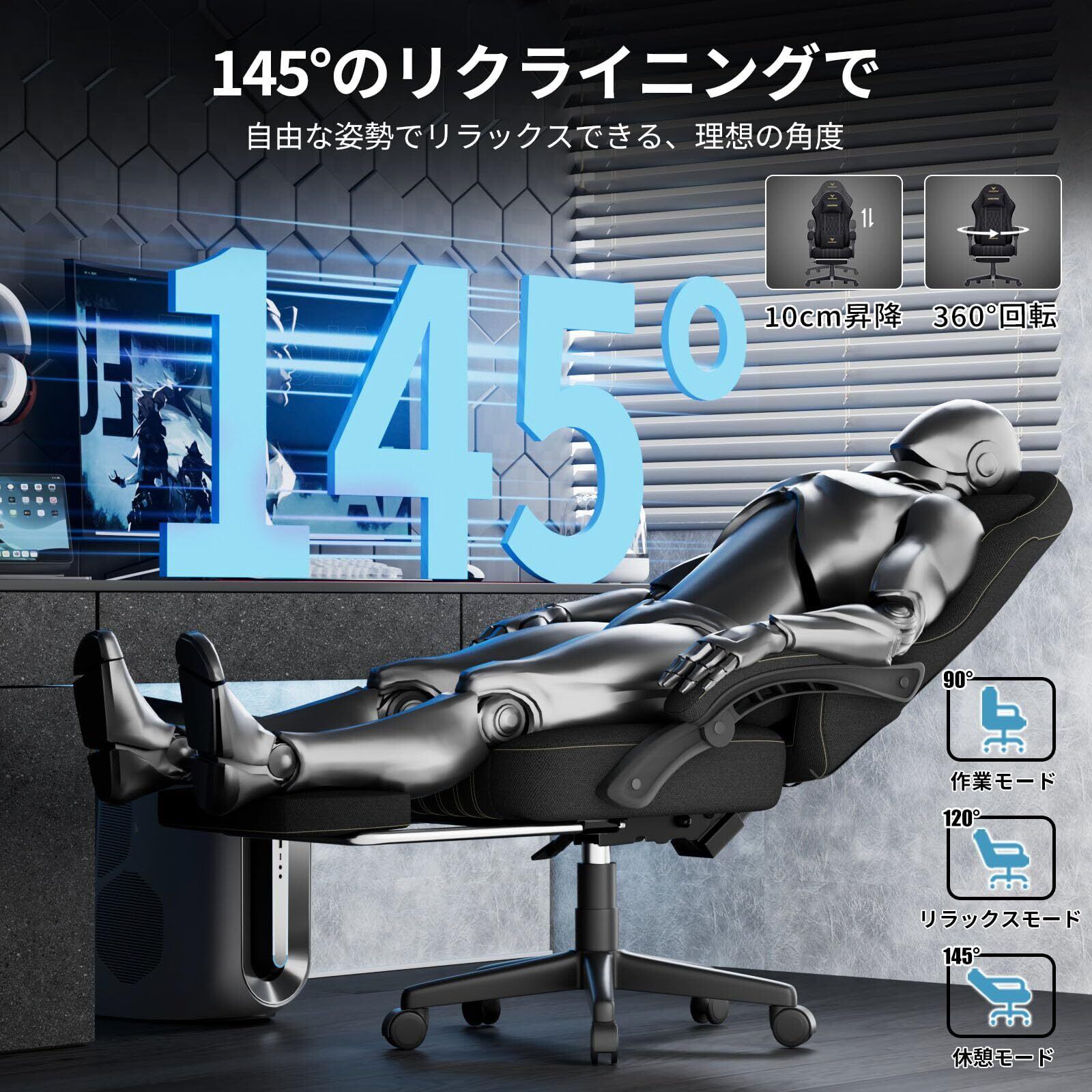 このゲーミングチェアは最大145°までリクライニングが可能です。仕事の合間やゲームの合間に、気軽にリクライニングしてリラックスできます。疲れた体を優しくサポートし、快適な時間を提供します!