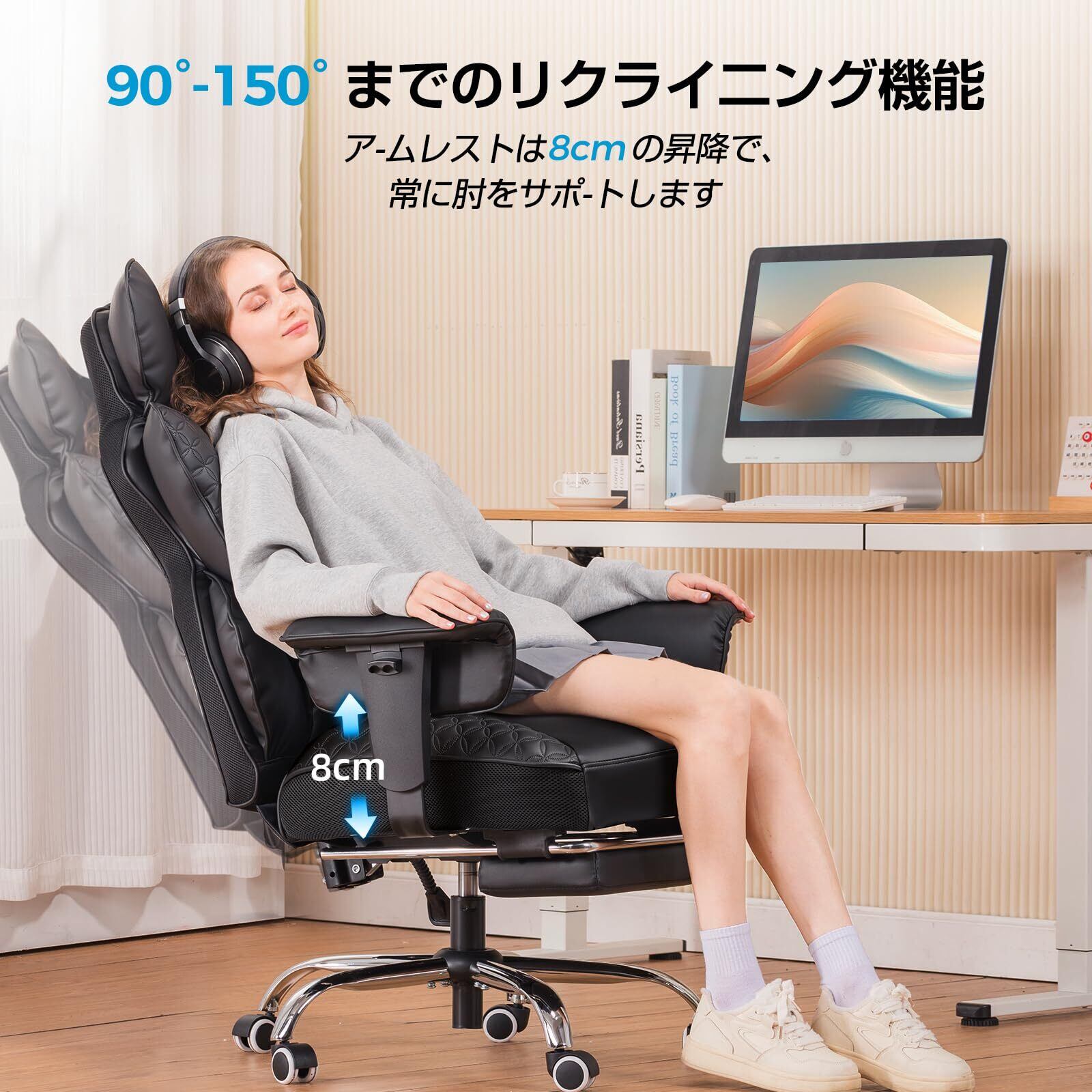 【アップグレードされた型押しデザインのチェア】本製品は、前の製品と比べてさらにユーザー体験を向上させました。「上品な型押しデザイン」×「腰部内蔵ポケットコイル」×「高さ調節可能なアームレスト」×「広めの背もたれ」×「肉厚のクッション」×「広々とした座面」×「PUレザー」×「一体型オットマン」×「反発力のある座面」×「ほぼフラットに倒せる150°リクライニング」など、多彩な機能が揃っています。このように魅力的なチェア、手に入れる理由がたくさん!