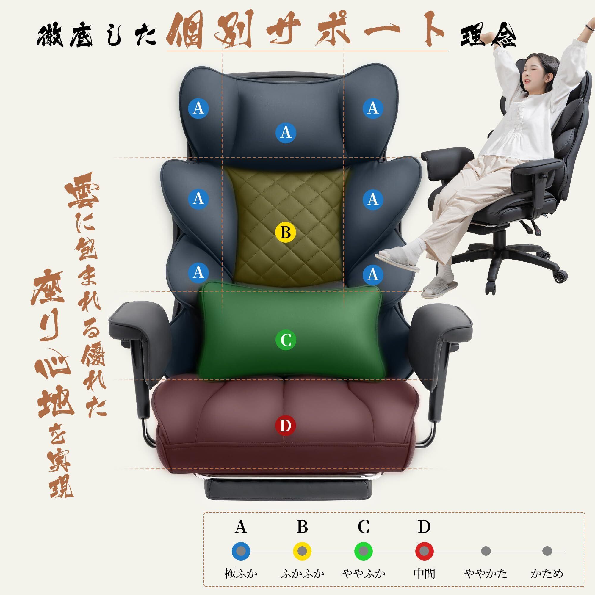 【個別サポート理念による快適さ】チェア全体が体を包み込むようなエレガントなデザインで、まるで雲の中に身を委ねているかのような包まれ感を実現しました。この包み込むような設計により、長時間の使用でも疲れにくく、快適な座り心地が続きます。また、【高級車用マイクロポーラスレザー】を使用しており、長時間座っても快適さを保ちます。異なるクッション密度を採用した「個別サポート」により、頭部から腰部、座面まで、最適なサポートを提供し、しっかりとした安定感をもたらします。さらに、座面の下には高品質な【ポケットコイル】が内蔵されており、しなやかな弾力性と安定感を実現します。
