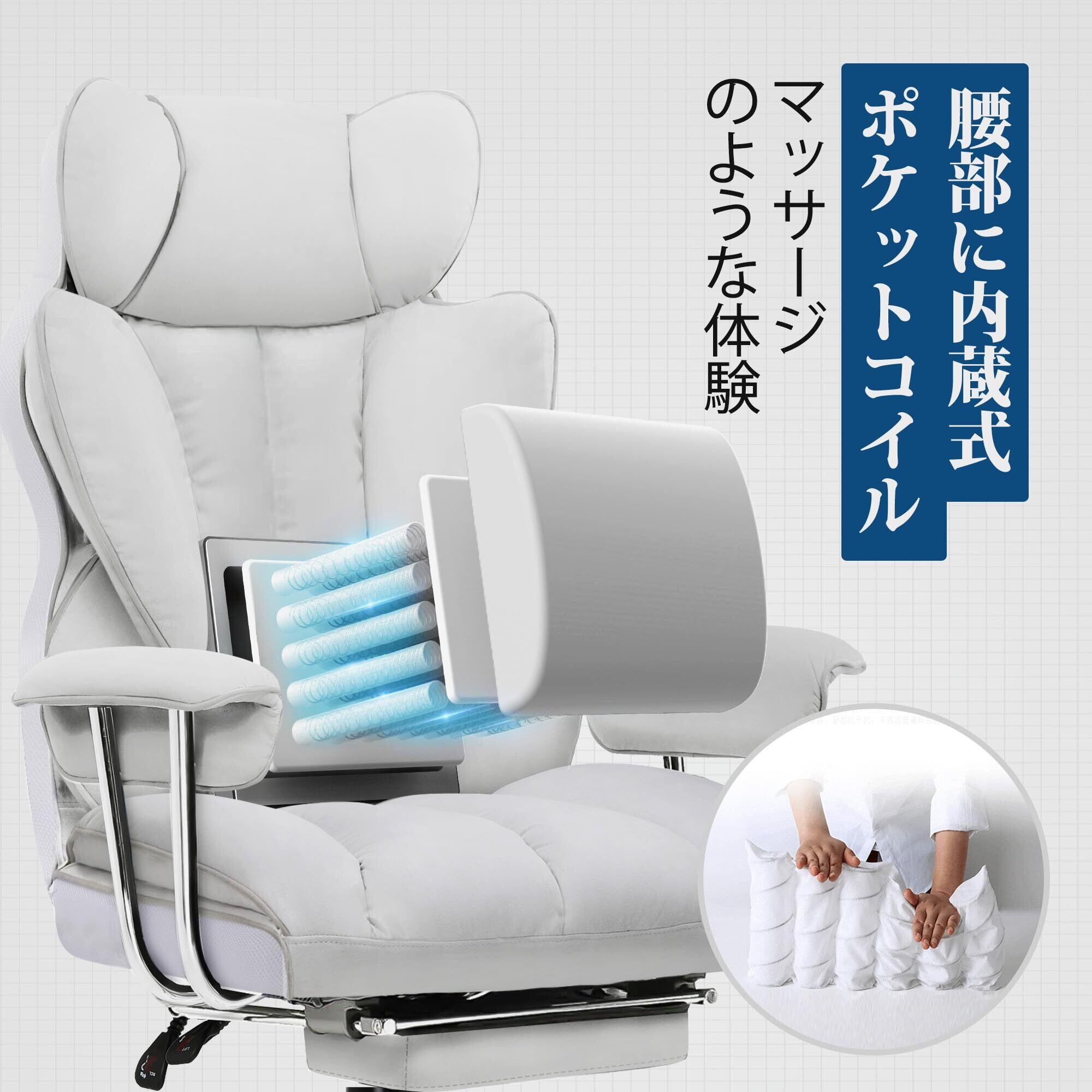 【人気選択理由】疲れ取れる分区サポート、背もたれにポケットコイル入れ、広い座面、頭までカバーできるハイバック、表面PP綿採用、通気性に優れたファブリック生地、柔らかい高弾性ウレタンのクッション素材、インテリアに馴染むデザイン 、最大140°リクライニング