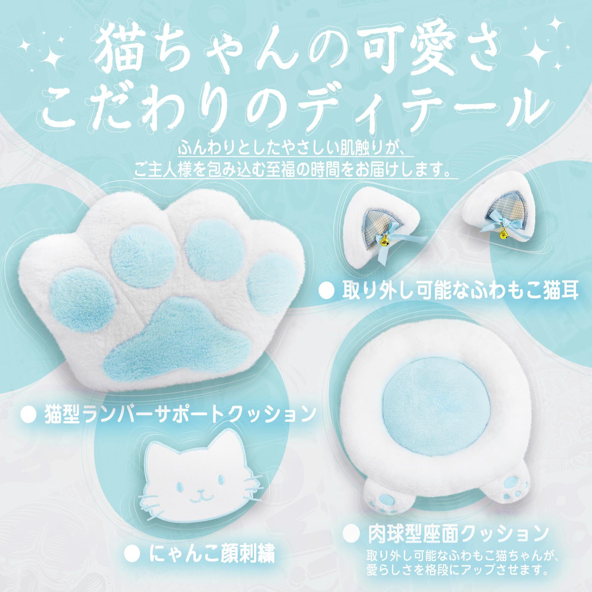 Dowinx ゲーミングチェア 水色 猫の肉球クッション 猫耳 かわいい にゃんこ顔刺繍 ヘアピン 鈴付き 猫柄 pc/オフィスチェア ゲーム用 パソコンチェア 椅子 可愛い 幅広 通気性 リクライニング オットマン 連動アームレスト ファブリック 白 ブルー&ホワイト LS-66D5204A