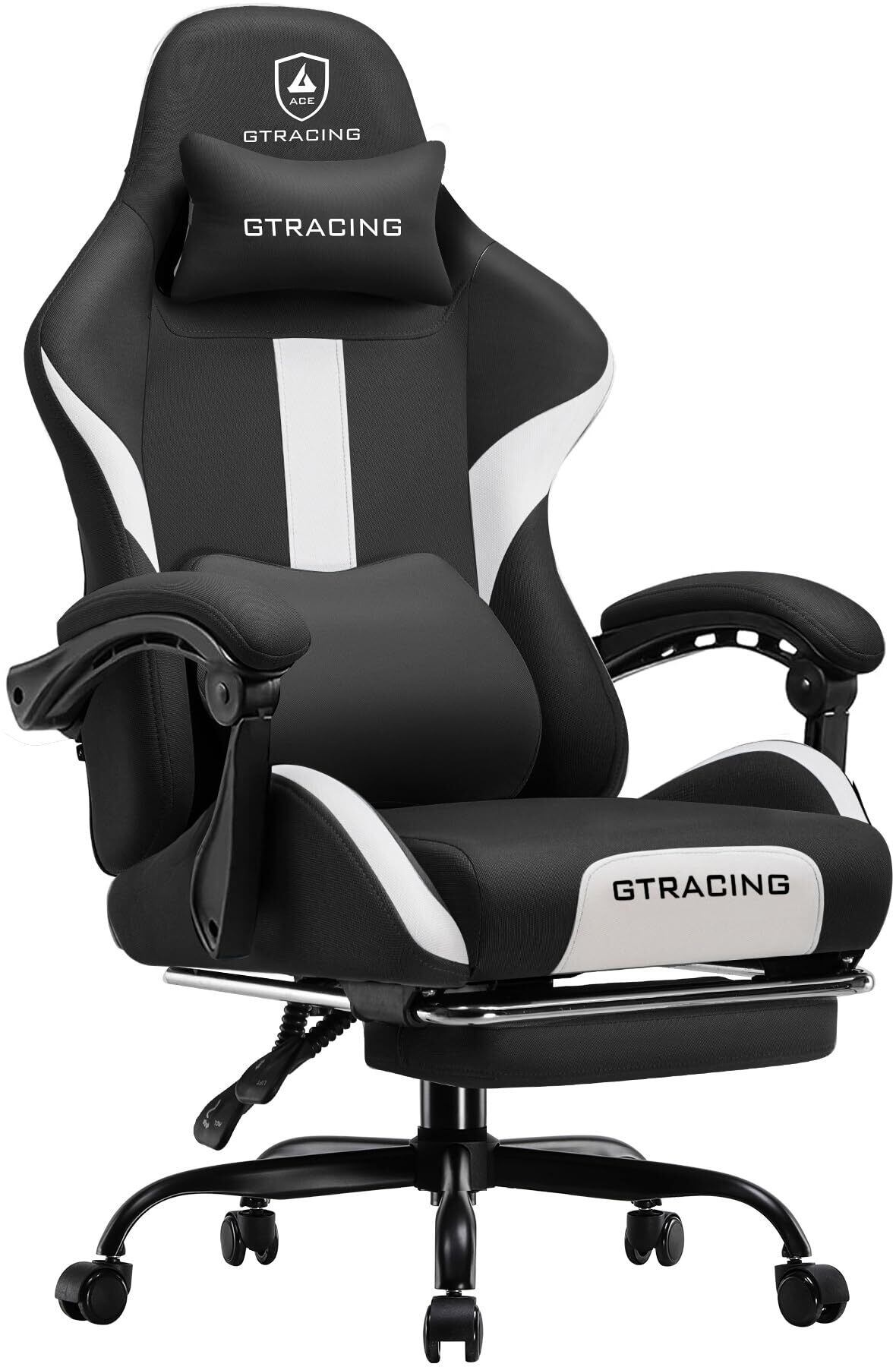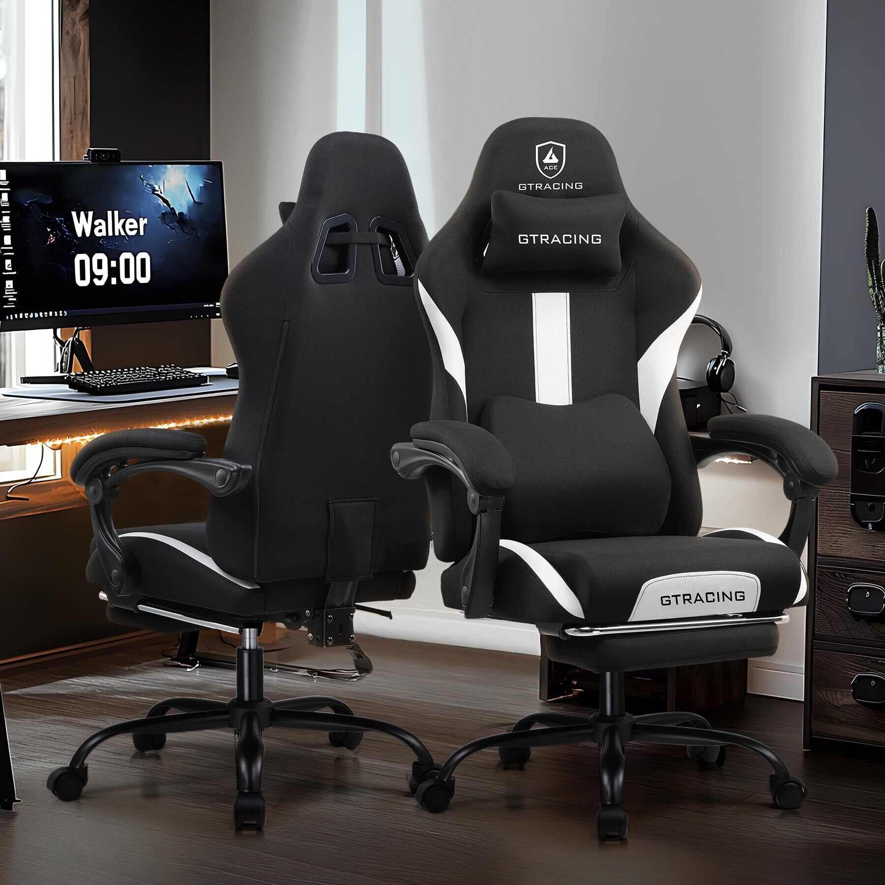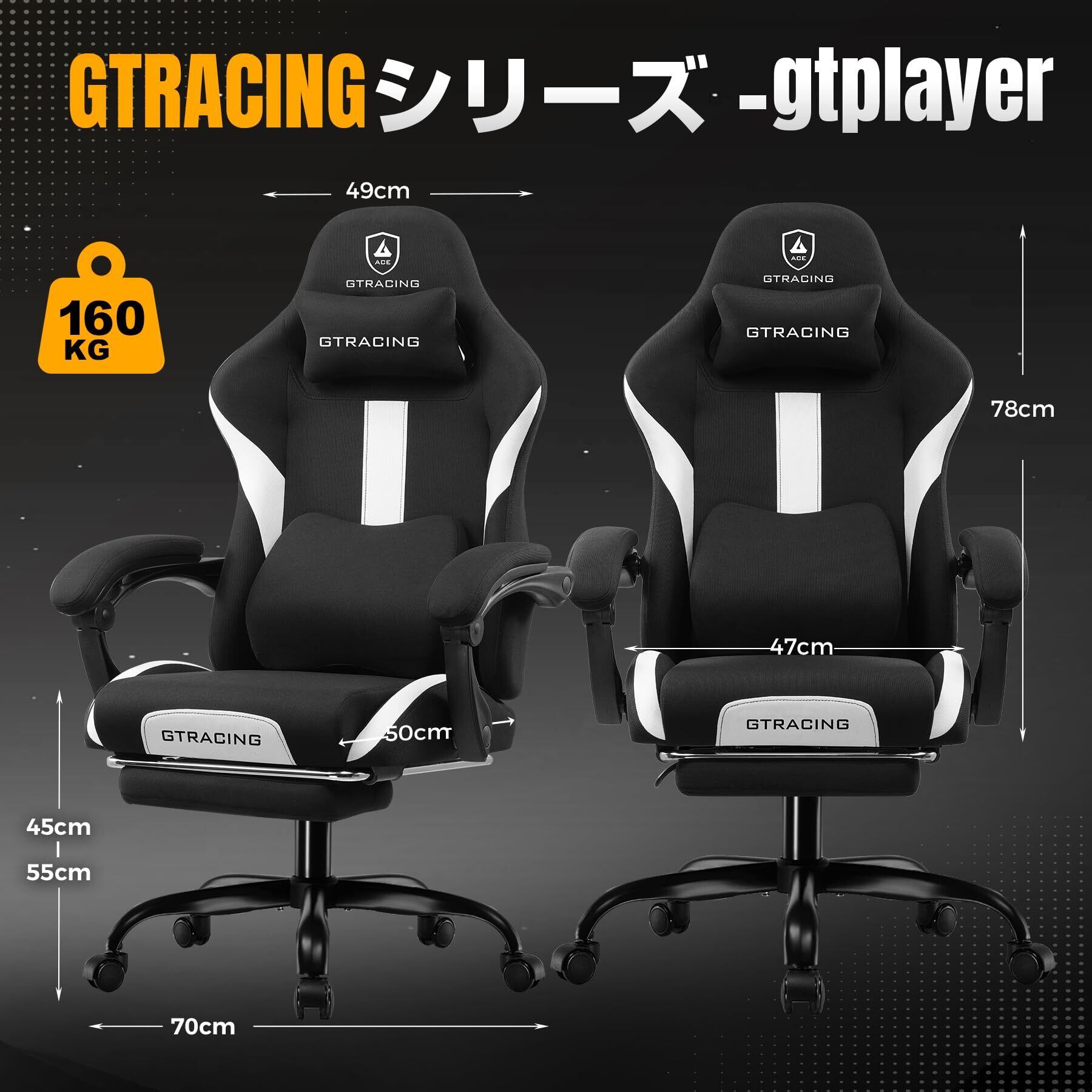 GTRACING ゲーミングチェア ファブリック デスクチェア 人間工学設計 腰痛対策 ポケットコイル 90°~150°リクライニング [一体式オットマン付き] 連動式アームレスト 蒸れない 高背もたれ ヘッドレスト&ランバーサポート 通気性メッシュ 高耐久性 GT905-Black