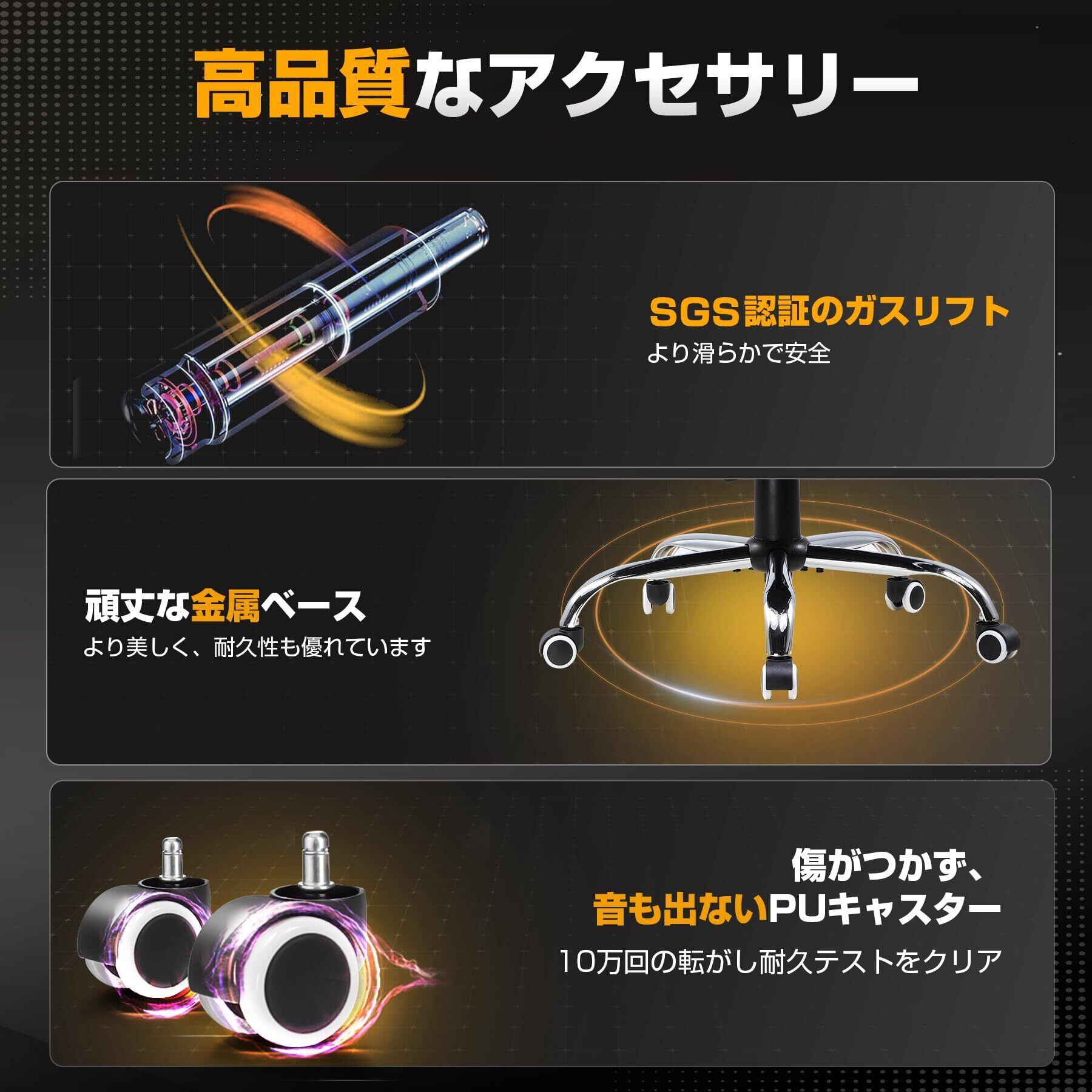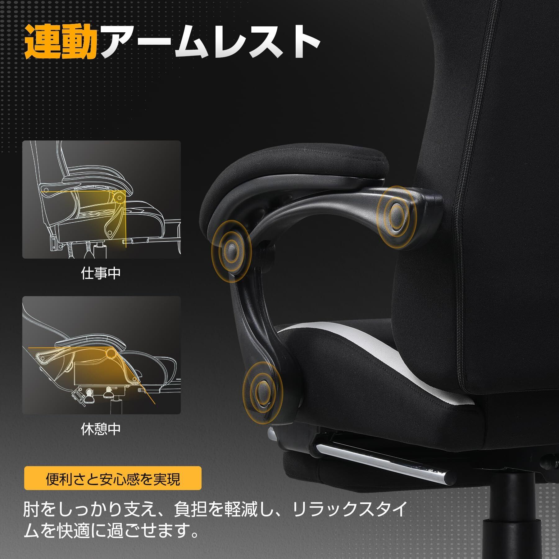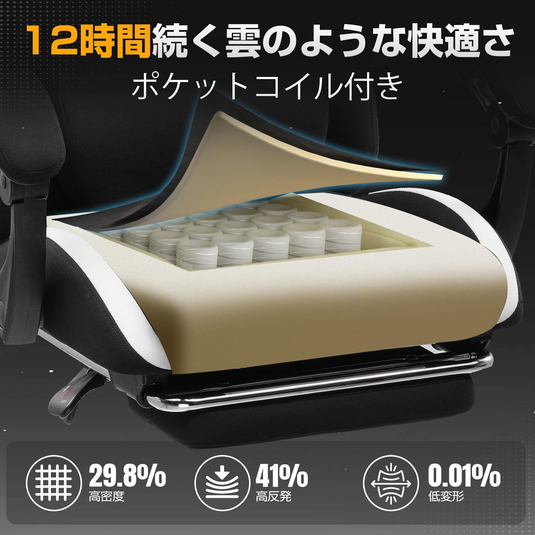 【夏も涼しい!通気性ある高耐久チェア】 従来のPUレザーゲーミングチェアは通気性が悪く、長時間の使用で蒸れやすい問題があった。は通気性ある革新的なファブリックを採用し、快適な座り心地を目指した。「ファブリック+メッシュ」×「ポケットコイル」×「広々とした座面」×「人間工学」×「個性的な腰サポート」×「90°~150°リクライニング」など、多機能を兼ね備えたこのチェアは、優れた性能で快適さを提供します。