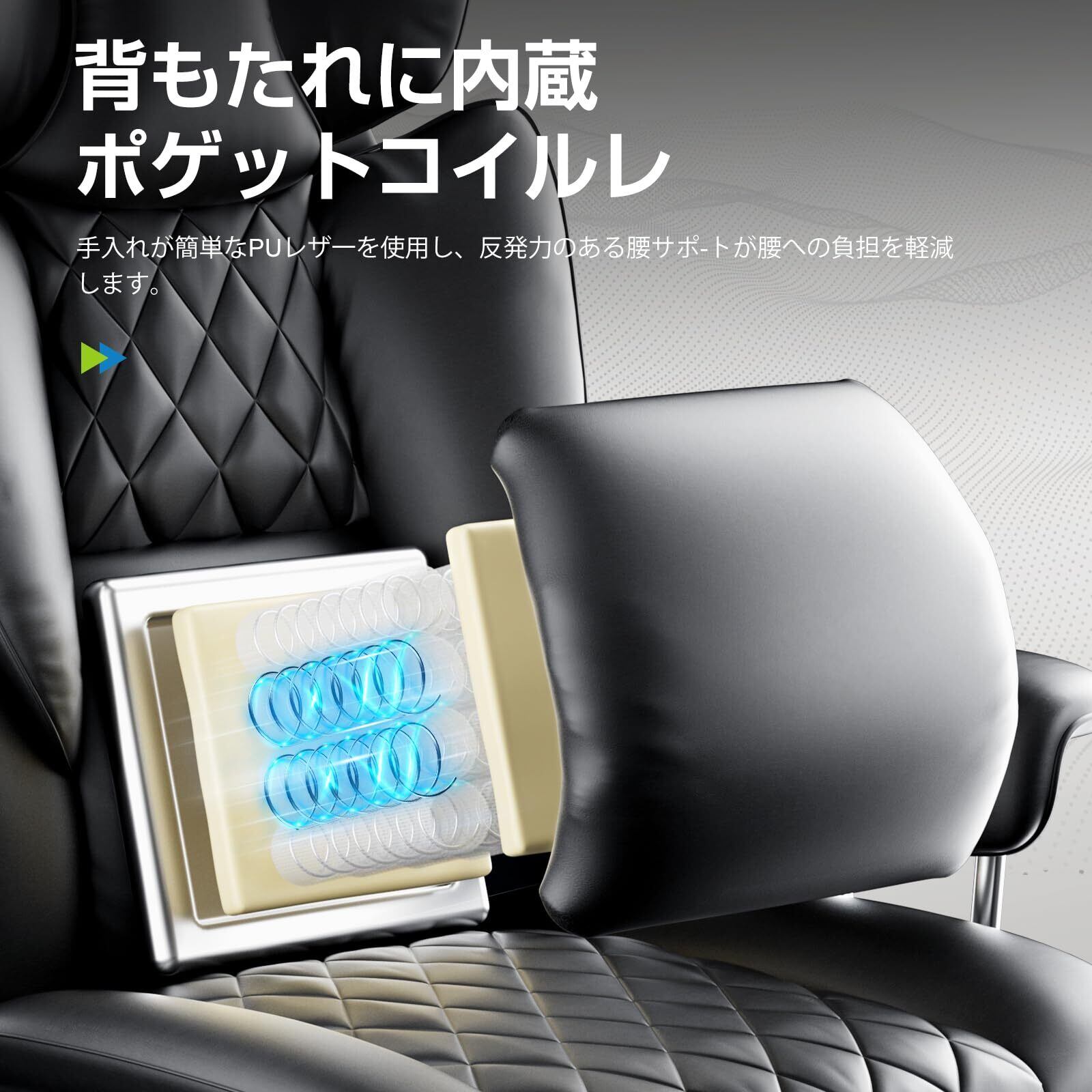 このゲーミングチェアは、キルティング技術を採用した上質なPUレザーと、ふわふわのPP綿を使用しており、快適な座り心地を提供します。蒸れにくい素材で、長時間の使用でも快適さを保ちます。ポケットコイルが内蔵されており、ソファのような座り心地を実現しています。