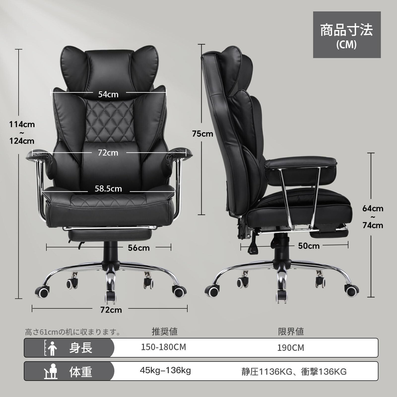 このチェアは、座面の高さを調節できるため、身長やデスクの高度にぴったり合わせることができます。広い座面はゆったりとした空間を提供し、あらゆる体格の方に対応します。