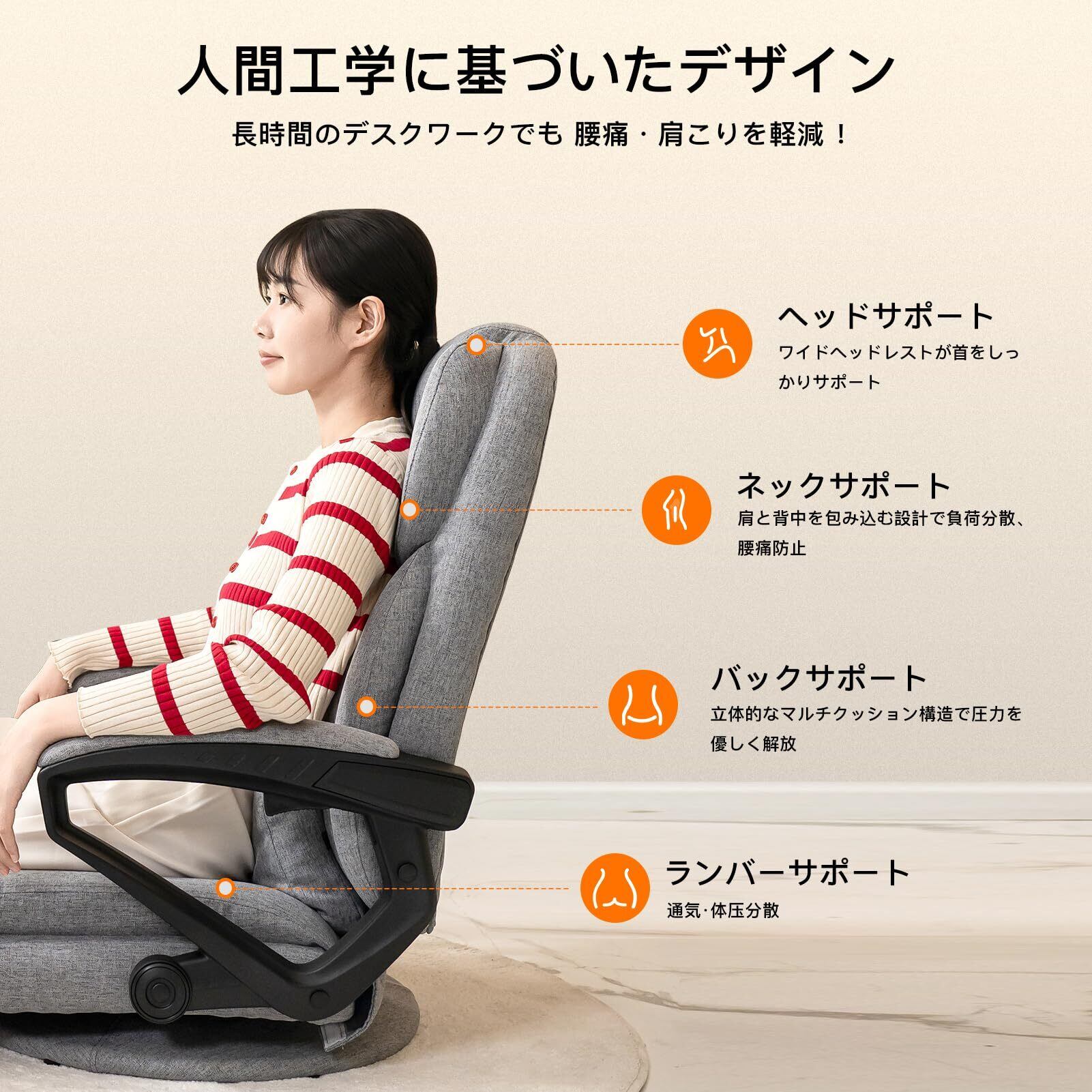 【シンプルモダンデザイン】通気性良好のフアプリック素材このファブリックは柔らかく心地よい肌触り。和室の畳から洋室のデスクチェアまで幅広くマッチする日本市場特化デザイン。