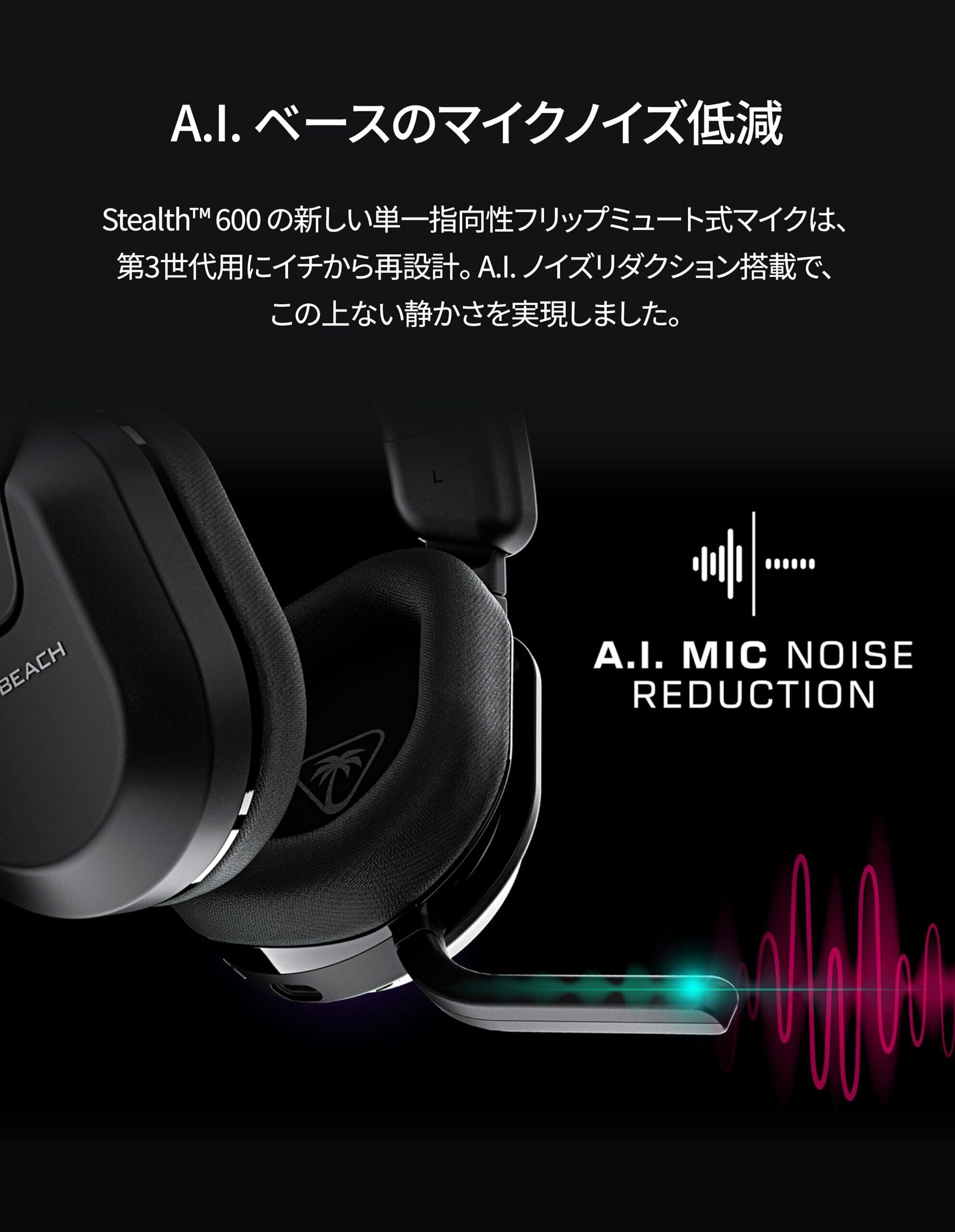 PlayStation®、PC、Nintendo Switch™、Steam Deck™、モバイル対応 Turtle Beach® Steal th™ 600 ワイヤレス マルチプラットフォーム ゲーミングヘッドセットは、勝利につながるゲーム周辺機器の 第 3 世代としてパワーアップしました。 QuickSwitch ボタンを使えば、低遅延ワイヤレス接続と Bluet ooth® 接続を簡単に切り替えられるので、一瞬のアクションも逃すことはありません。 Gen 3 では、A. I. ノイズリダクション搭載フリップミュート式マイクで指示をはっきりと伝え、50mm Nanoclear™ ドライ バーによって細かいゲーム内オーディオを正確に聞き取れます。 さらに、Swarm™ II のコンパニオンアプ リを使って、マイクやオーディオの設定を自分の好みに合わせて調整できます。 また、最高クラスとなる 80 時間のバッテリー持続時間とメモリーフォームイヤークッションにより、何時間でも快適にプレイできま す。