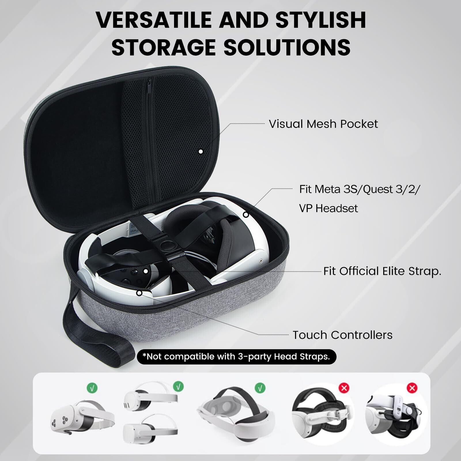 このキャリングケースは、Quest 3S、Quest 3、Quest 2、そしてそれぞれのアクセサリーにぴったり合うように特別に作られています。公式Eliteストラップと完全に互換性があり、シームレスなフィット感と快適な使用感を実現します。ただし、サードパーティ製のヘッドストラップとは互換性がありませんのでご注意ください。