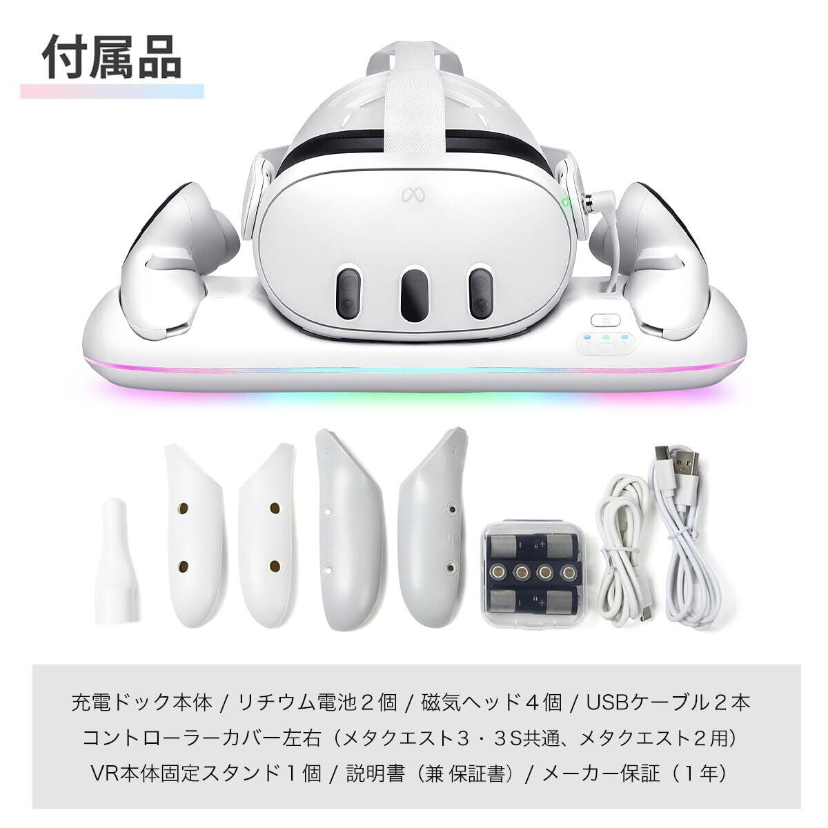 【付属品】充電ドック本体、リチウム電池2本、磁気ヘッド4個、USBケーブル2本、コントローラーカバー左右(メタクエスト3/3S共通・メタクエスト2用)、VR本体固定スタンド1個、説明書(兼 書)がついています。