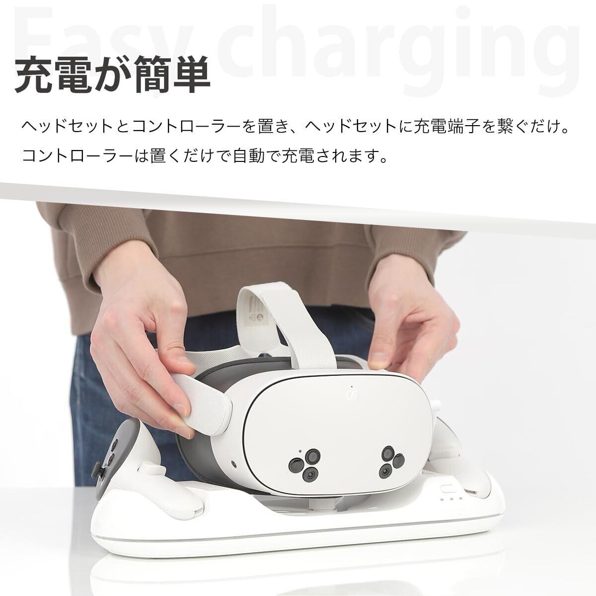 【かんたん充電】ヘッドセットとコントローラーを置き、ヘッドセットを充電端子に繋ぐだけ。 コントローラーは置くだけで自動で充電されます。