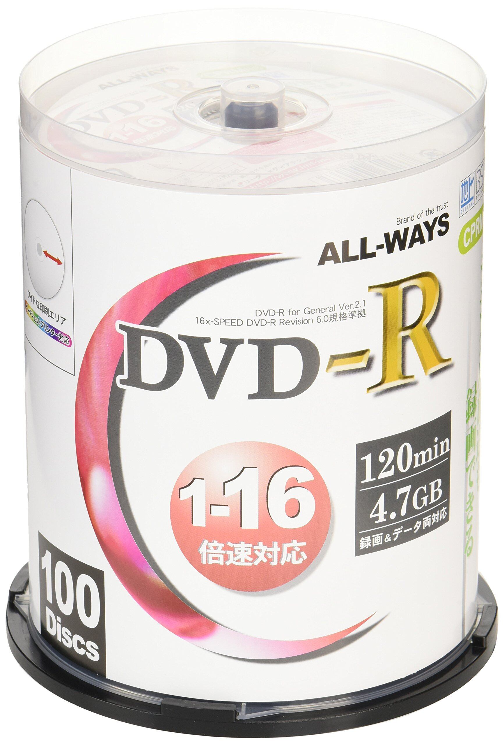ALL-WAYS DVD-R 4.7GB 1-16倍速対応 CPRM対応100枚 デジタル放送録画対応・スピンドルケース入り・インクジェットプリンタでのワイド印刷可能 ACPR16X100PW