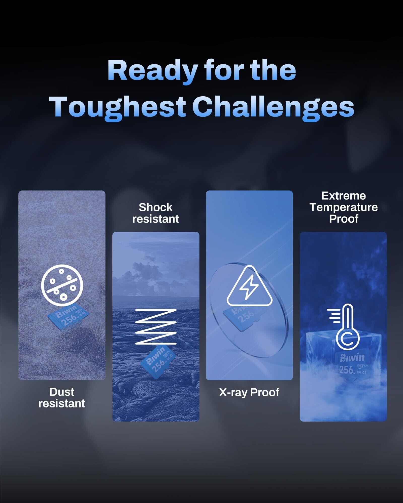 BiwinのmicroSDカードは、耐衝撃、耐温度、耐X線など、多方面からデータをしっかり守る設計が施されています!旅行やアウトドアでの使用でも安心してご利用いただけます。